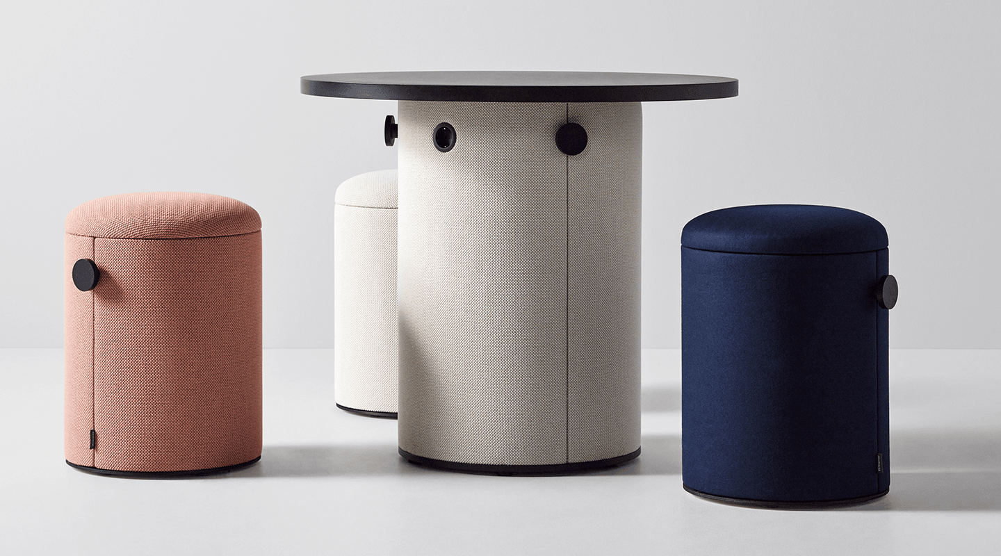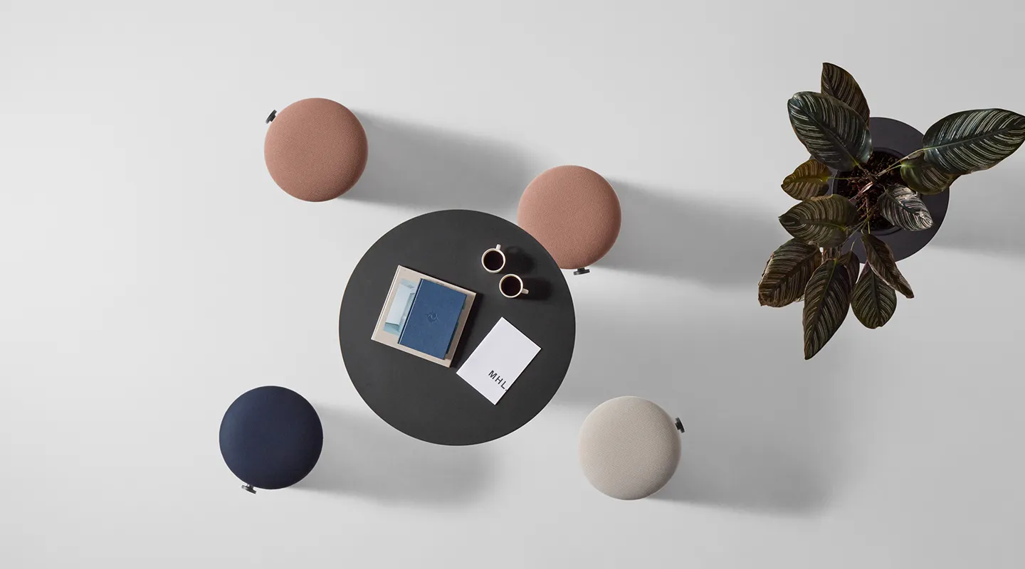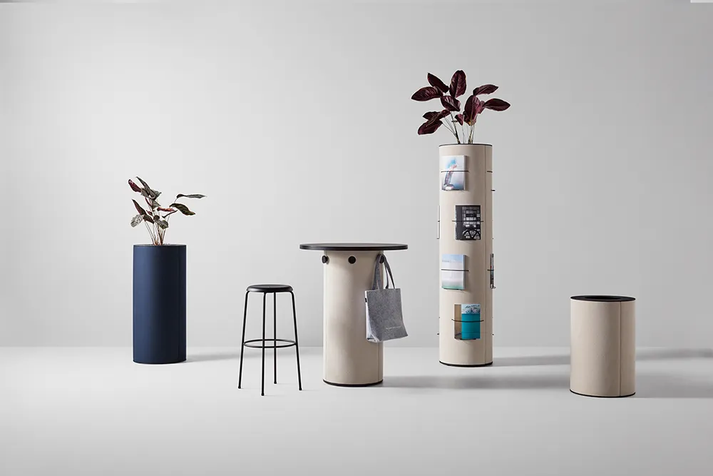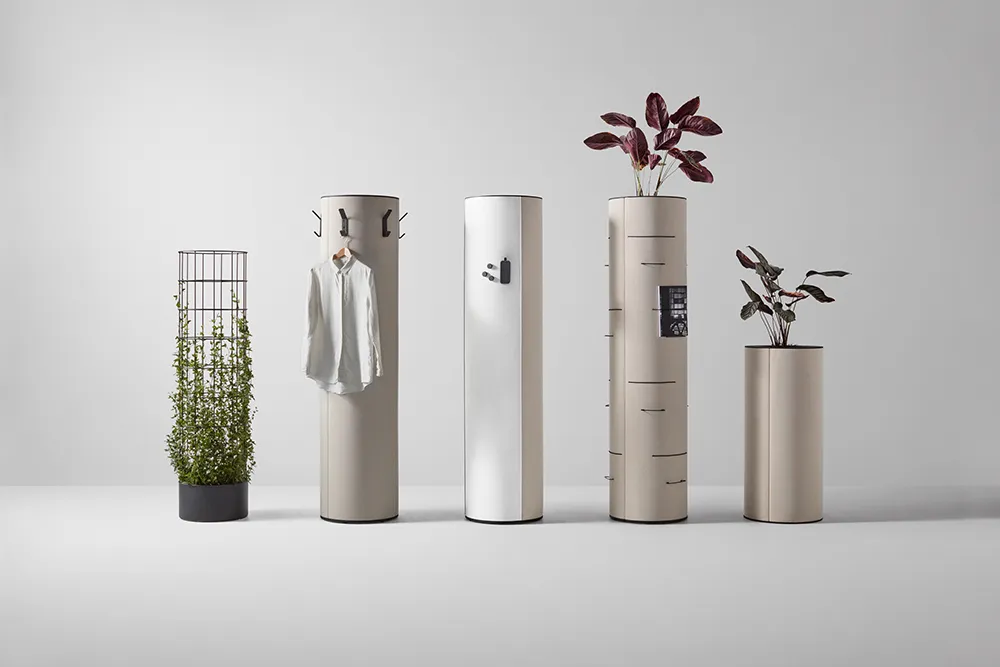 dB Pillar includes tables, stools, and pillars in various heights. Several pillars with different additional features are available: pillars with whiteboard, with support for climbing plants, with magazine holders, with flower pots, and with coat hangers.