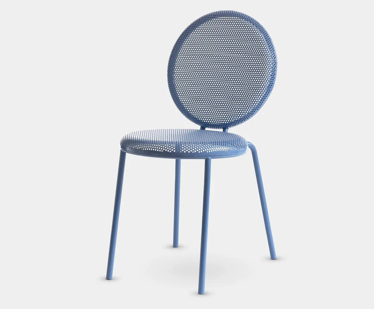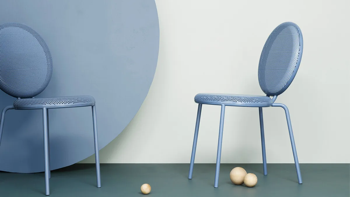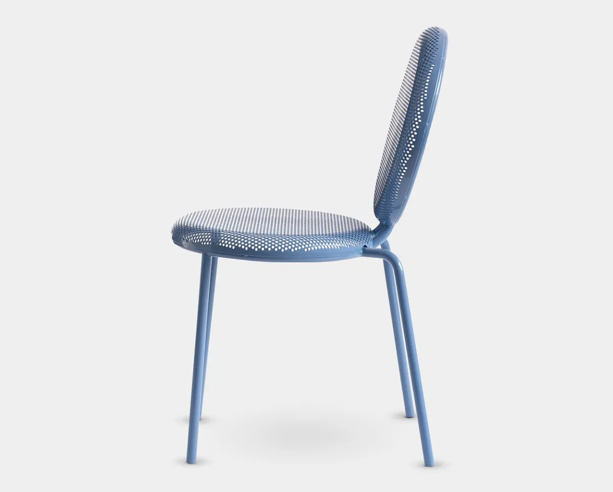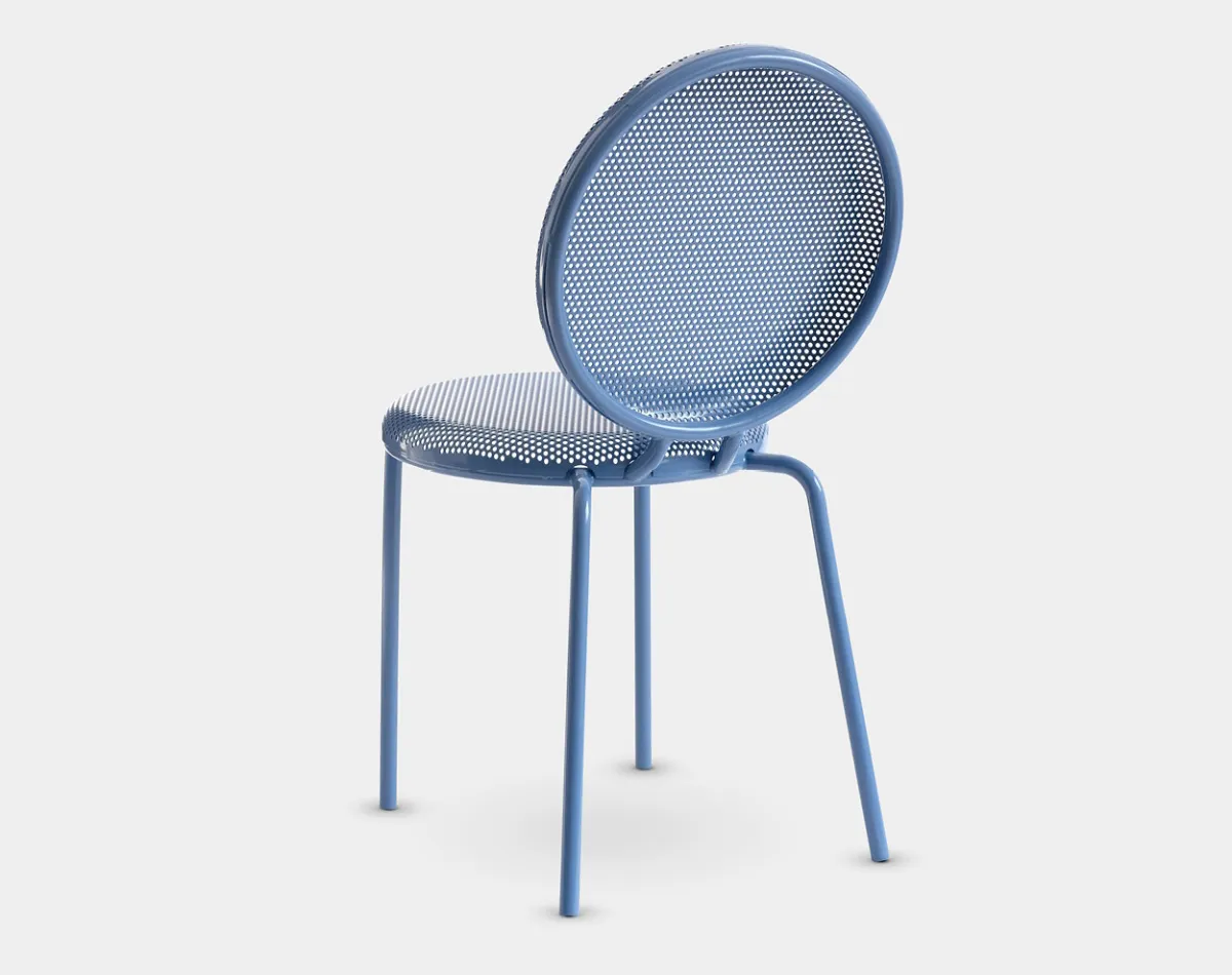 “Inspired by the iconic Thonet bistro chairs, my idea was to design a contemporary variant of the café/bistro bentwood and perforated-seat chair. Drawing on the raster design, the result was a unique seat and backrest where the seating surface appears to float above the frame. Only one factory in Sweden is able to mould the state-of-the-art seat. The chair is made from powder-coated steel”.