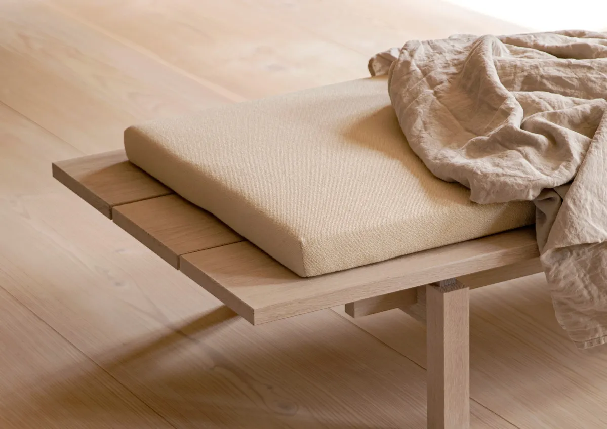 The collection consists of eight products that speak to each other in a common language that activates your senses and sparks curiosity about the material. In addition to five individual pieces of furniture, the collection features finished furniture planks, DD-2 – an interior scent launched in 2019 – and Dinesen Bricks. Dinesen Bricks are made of surplus wood from Dinesen’s own production and can be used as decorative objects or as cutting or serving boards. The cushions feature quality upholstery from Sørensen Leather and Kvadrat.
