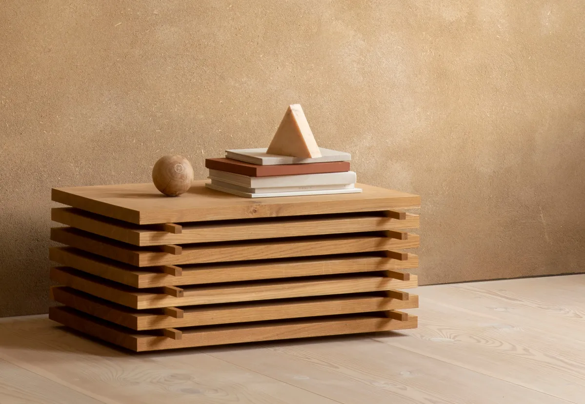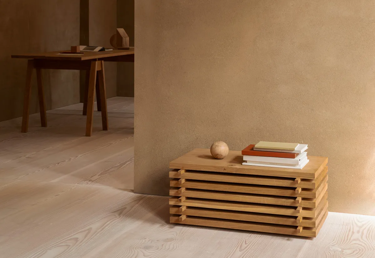 The inspiration behind the collection springs from the drying process that the wood undergoes on its way to becoming iconic Dinesen planks. When the timber arrives at the sawmill it is cut, and the planks are stacked with cubic spacers in between to allow the air to circulate freely. The spacers let the solid wood float freely and present the natural material, which is perfect in its basic form. The stacked planks are thus a recurring design feature throughout the collection – with clear inspiration from Dinesen’s brand DNA.