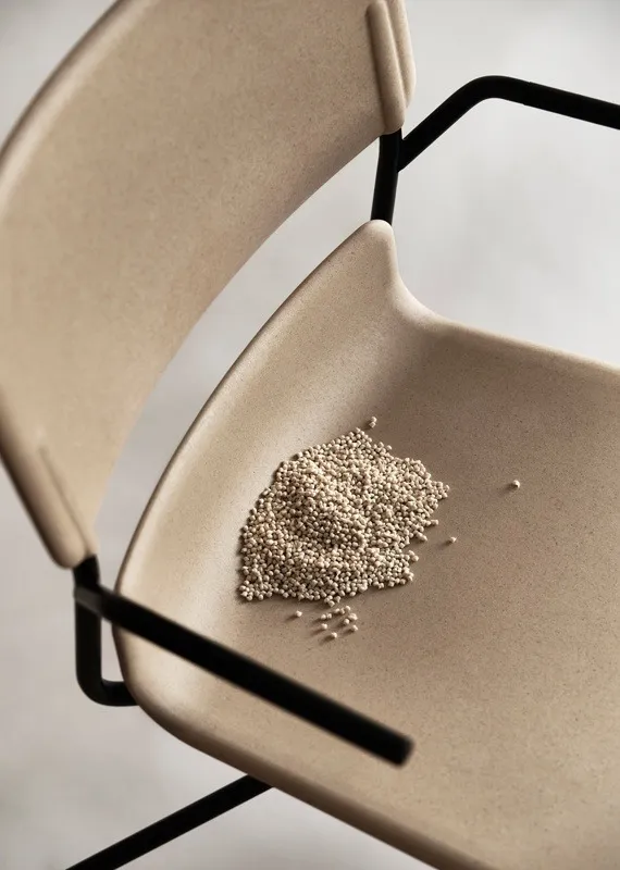 A comfortable chair in recycled plastic, where we replaced the traditional fiberglass with hemp fiber. This makes the chair lighter and gives it a low CO2 footprint, about 80% lower than similar plastics. The hemp also gives the plastic a softer and warmer tone, almost a textile feltfeeling in wood color.