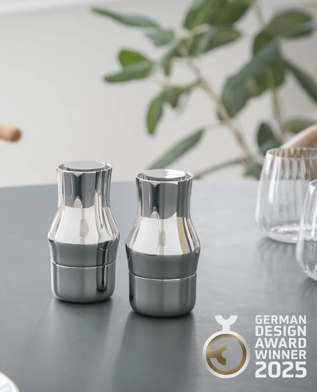 The beautiful, minimalist grinder in polished stainless steel adds an elegant cohesion to the table …