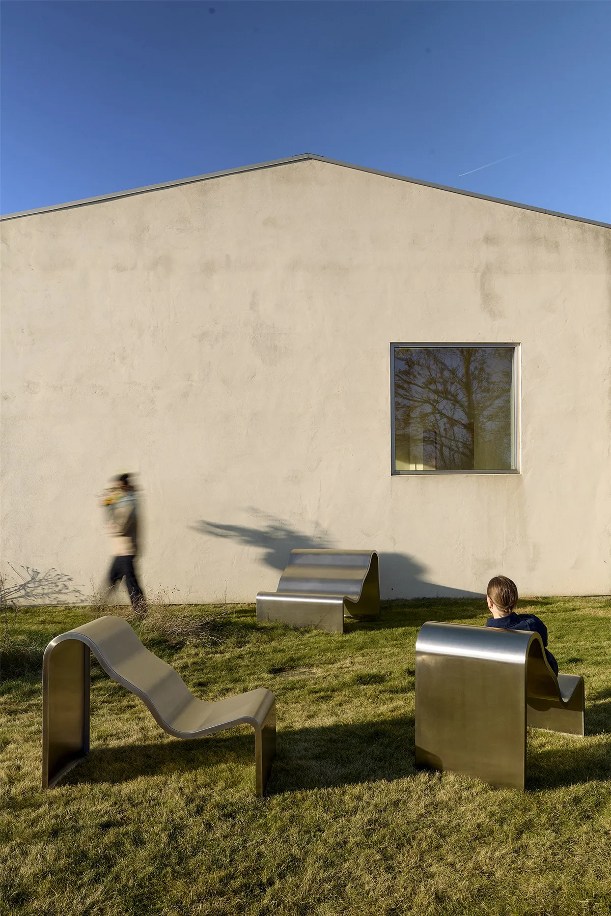 With its smooth curves that follow the body’s natural form, the bench invites focus towards the sky, offering a space for daydreaming and relaxation.