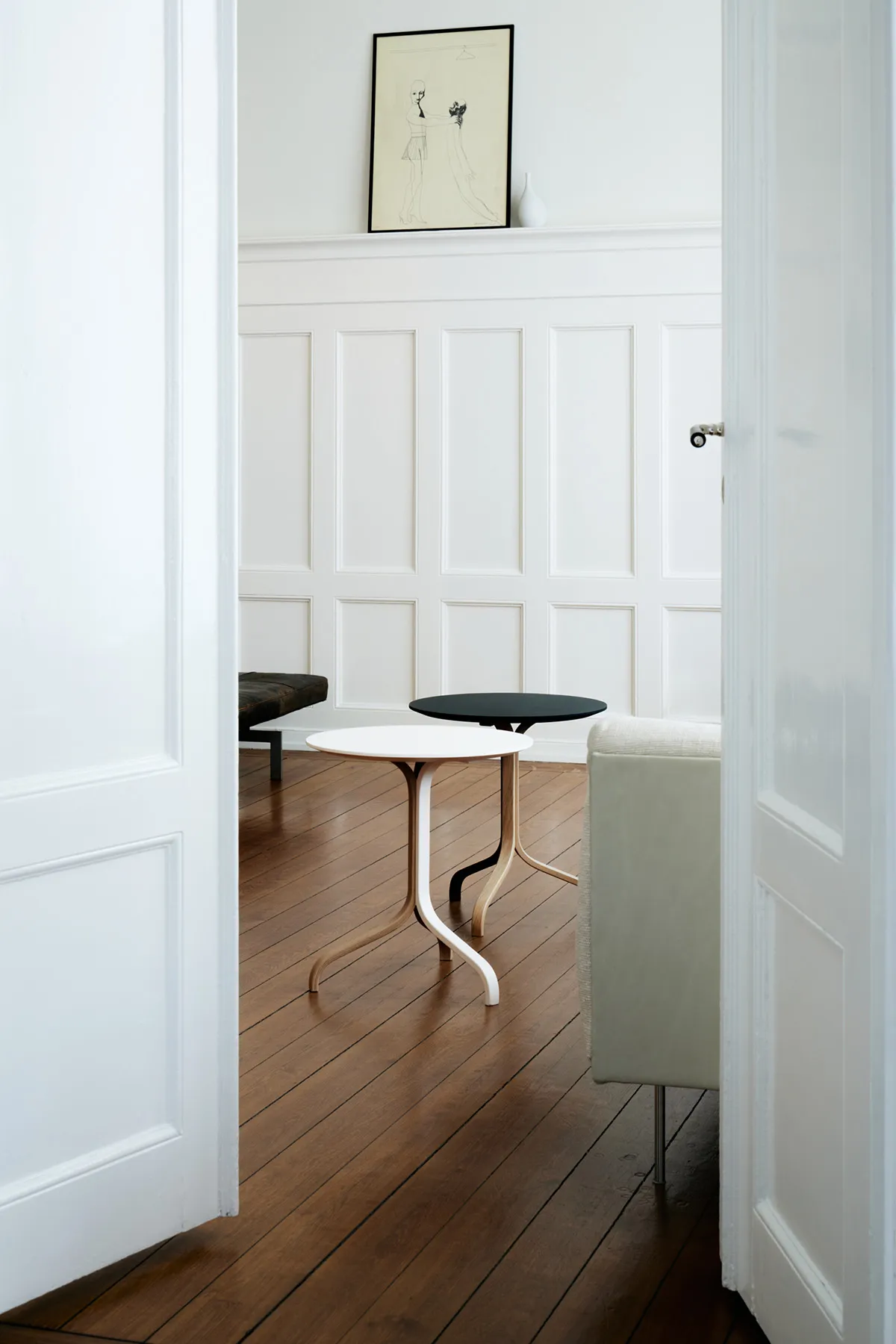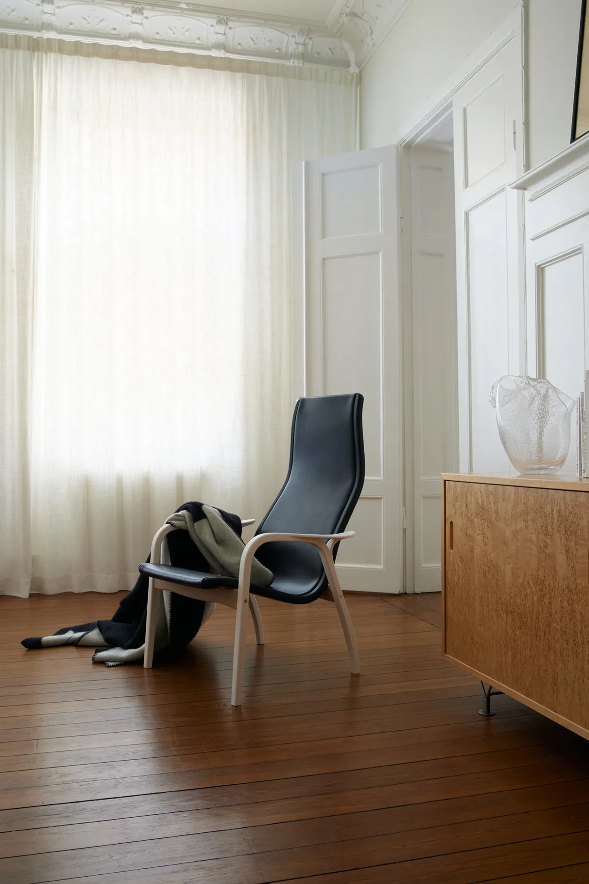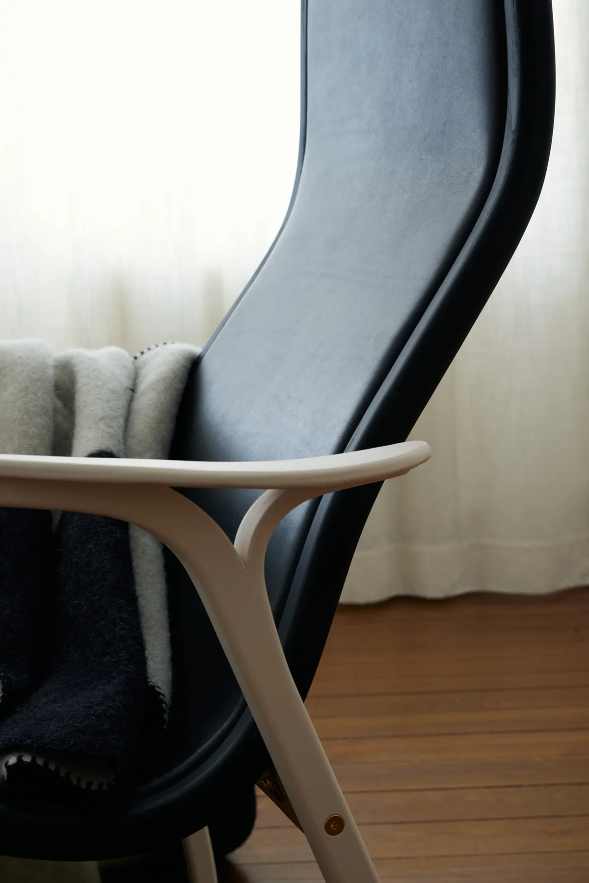 Lamino is Swedese’s most well-known easy chair, signed Yngve Ekström in 1956. Duality is an interpretation of Yngve’s classic piece made by father and son, Gert & Rasmus Wingårdh, studio Wingårdh & Wingårdh. Duality – a contrast between two aspects, a dualism. What happens when a maximalist meets a minimalist? When macro design meets micro design? When an architect and a fashion designer meet outside their usual area of expertise. Duality is a tribute to the shapes of Lamino. Where Gert and Rasmus chose to highlight the already existing. With a light and a dark color setting, a contrast and a dynamic is created. The armchair is made of oak where the legs and outer frame of the seat are emphasized through contrasting colors in black and white. The seat is upholstered in saddle leather and the back with a natural colored linen fabric. The easy chair is available in a white and a black version. The Duality collection also includes tables and a blanket.
