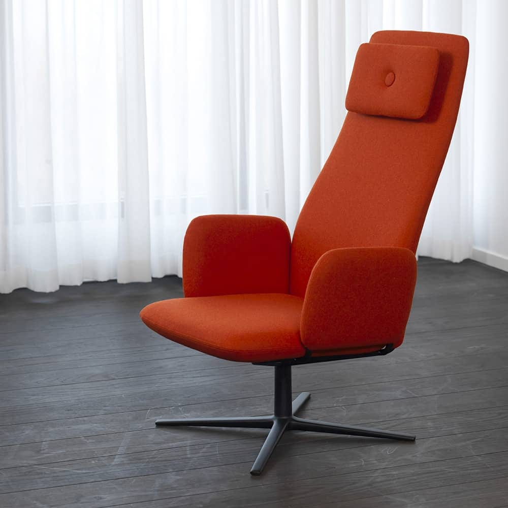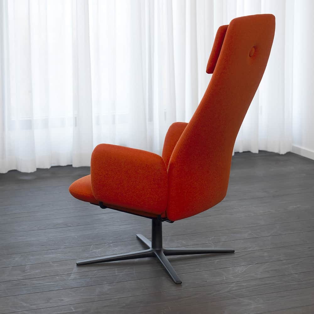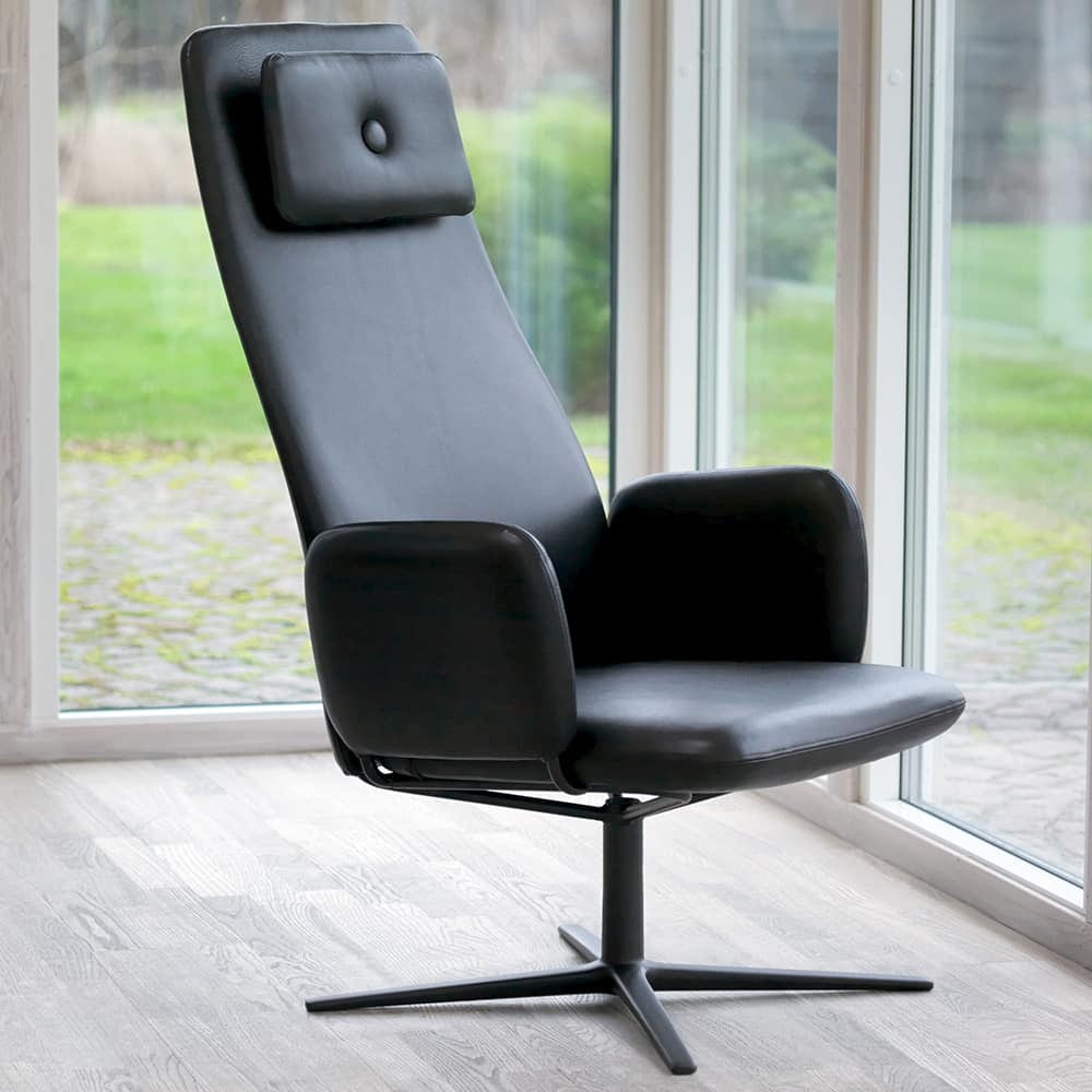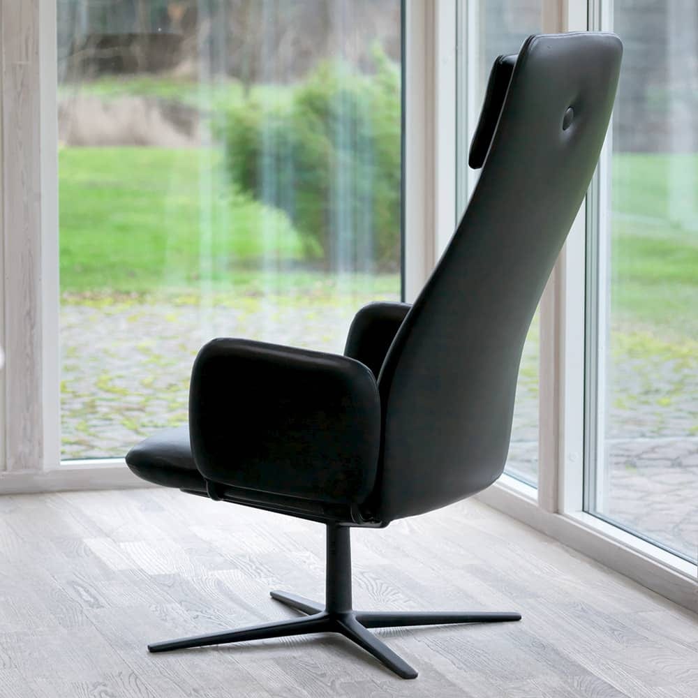 The Dundra family just couldn’t do without another, even more stylish easy chair. The high backrest ensures relaxed comfort, and the swivel cross-frame allows for movement even when resting your legs on the footstool. Stefan Borselius has once again produced a contemporary, almost classic feeling, with the covered button as his distinct hallmark. The high backrest welcomes the short and the tall without compromise, and full head support allows both relaxation and reading. The Dundra easy chair comes in fabric or optional leather with the molded foam padding supported by nozaq springs.