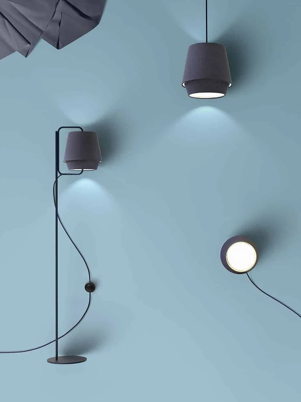 Glittering lakes, wilderness and flora. Elements’ simple shapes direct the light and well-balanced materials give the design elasticity and great usability; these textile fixtures are available in a series of monochrome colour components. Element is available as pendant, floor, table or wall lamp in two sizes.