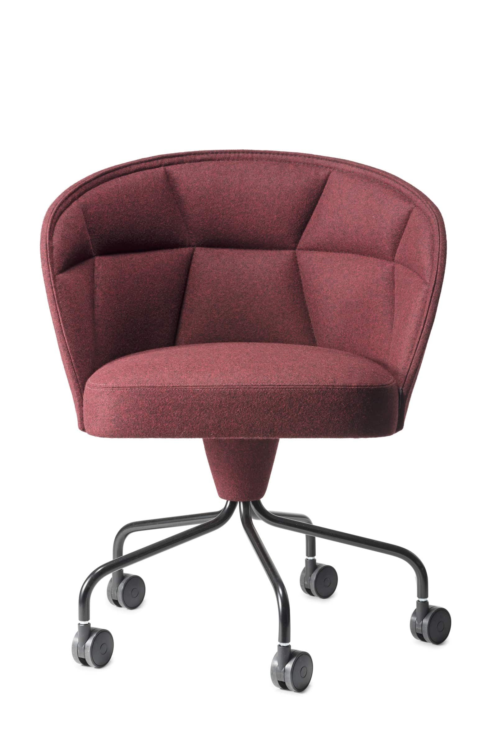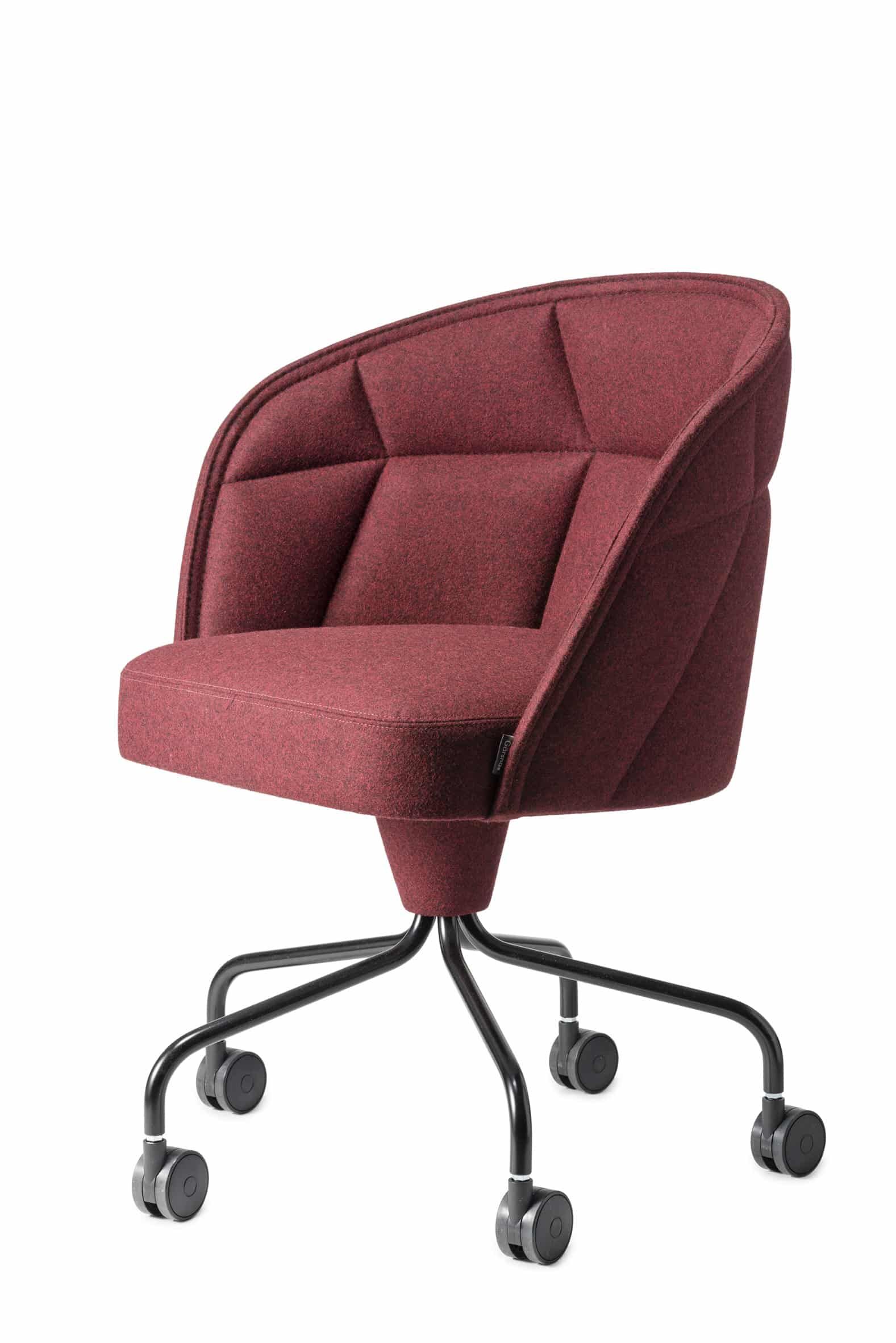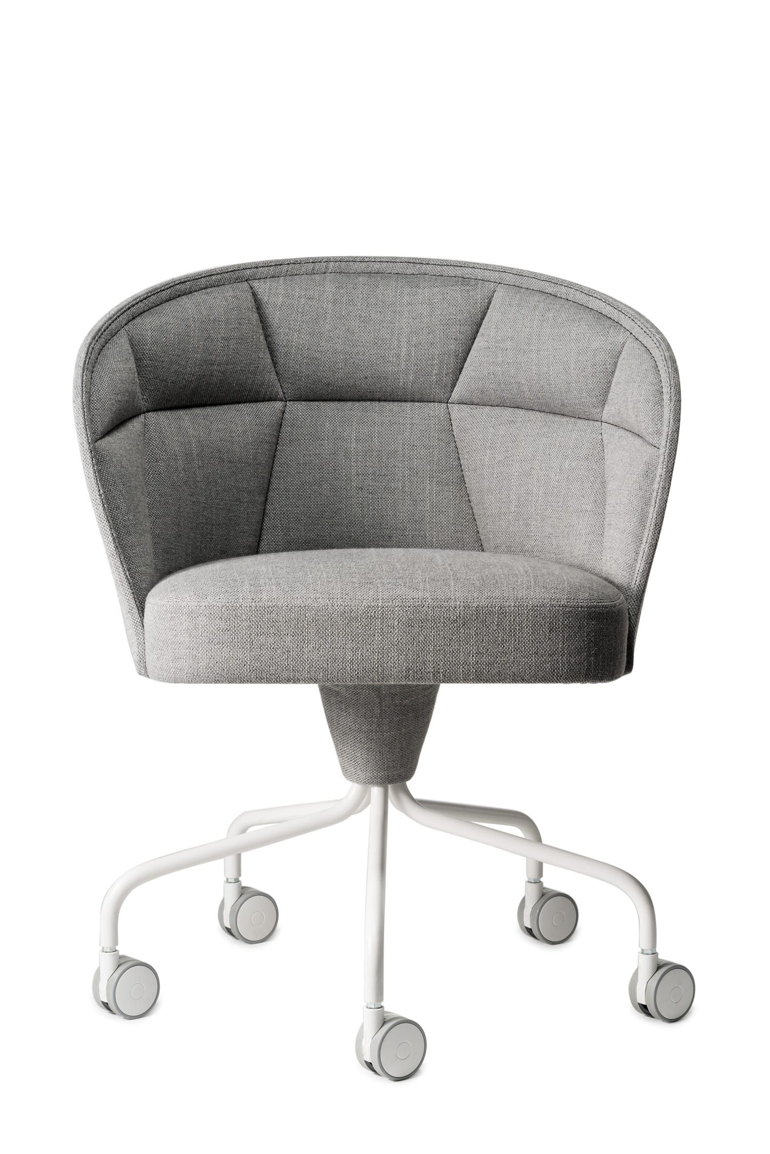 “Emily is a dainty armchair that envelops you. Its well-tailored, feminine character is accentuated by the soft textile part extending down into the hard metal frame. An organic idiom without no hard edges, and the sophisticated stocking detailing makes Emily an wholly unique swivel chair for use in many new contexts.”