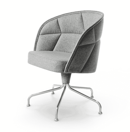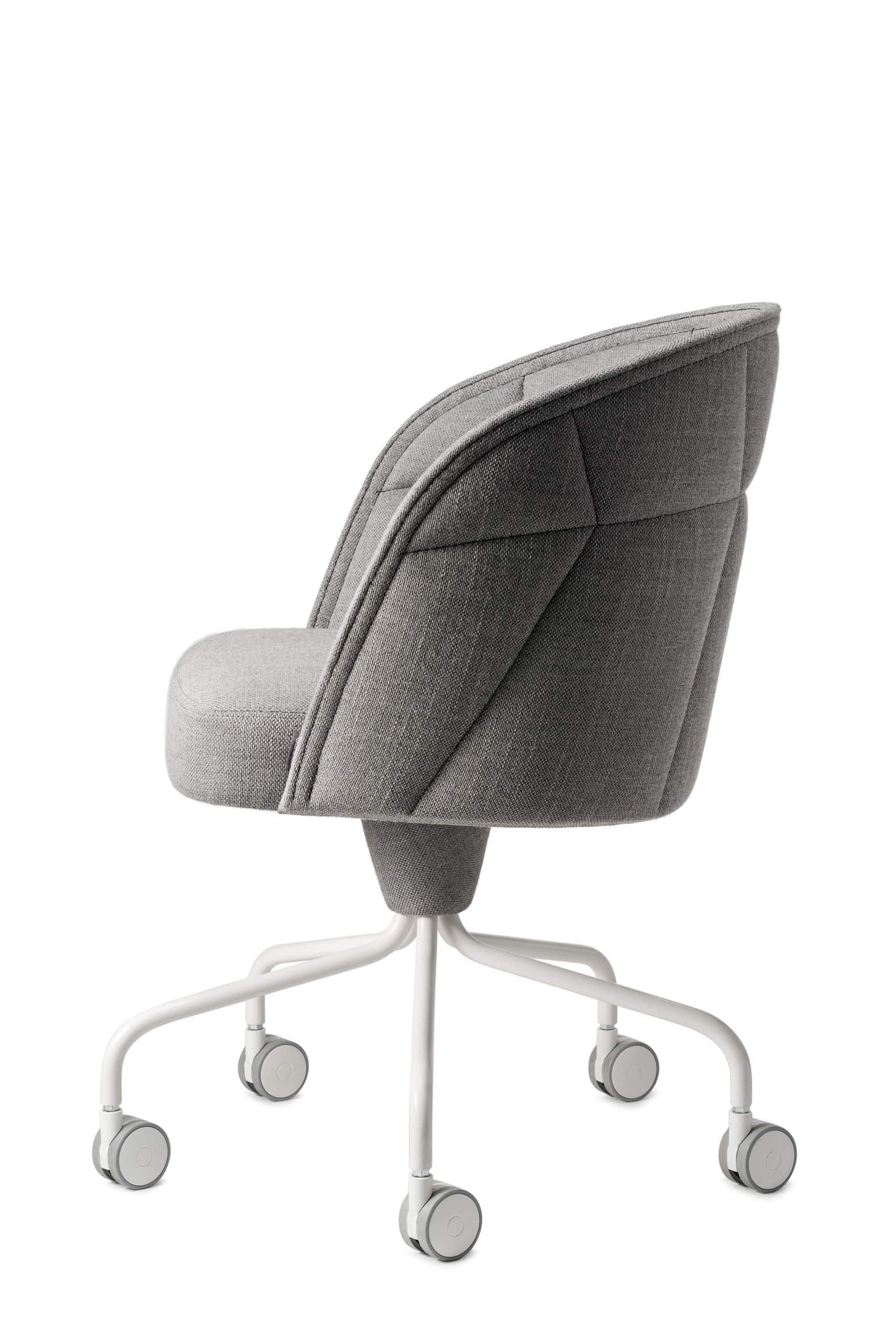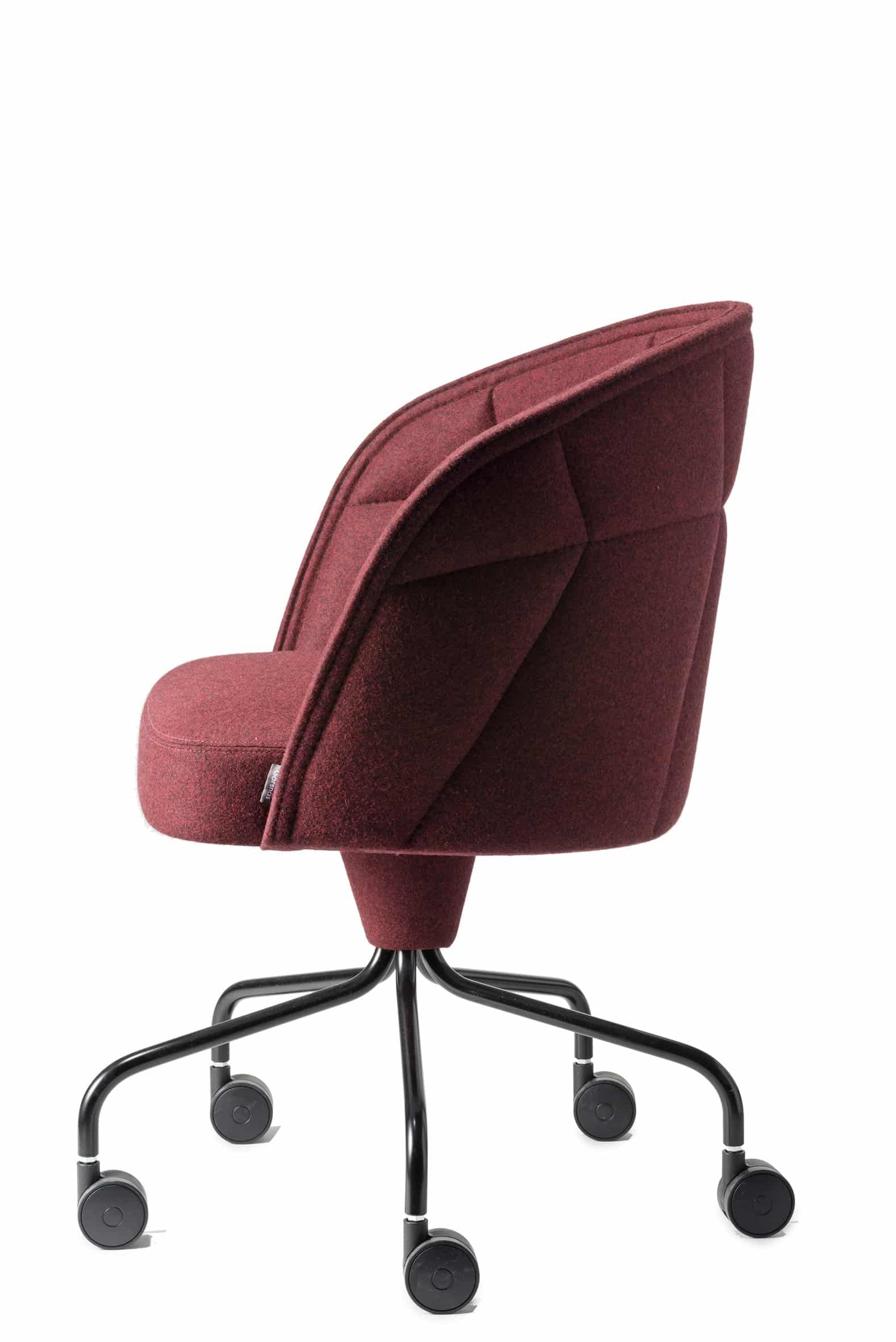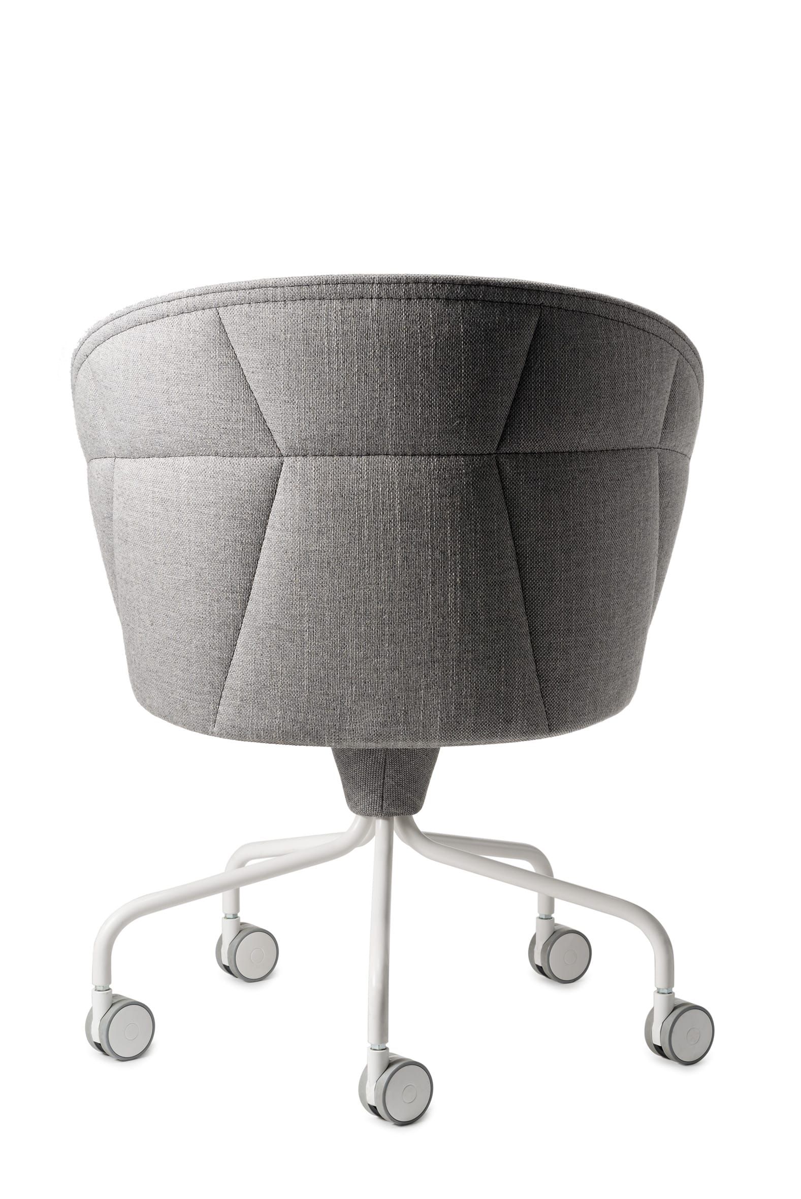 “Emily is a dainty armchair that envelops you. Its well-tailored, feminine character is accentuated by the soft textile part extending down into the hard metal frame. An organic idiom without no hard edges, and the sophisticated stocking detailing makes Emily an wholly unique swivel chair for use in many new contexts.”