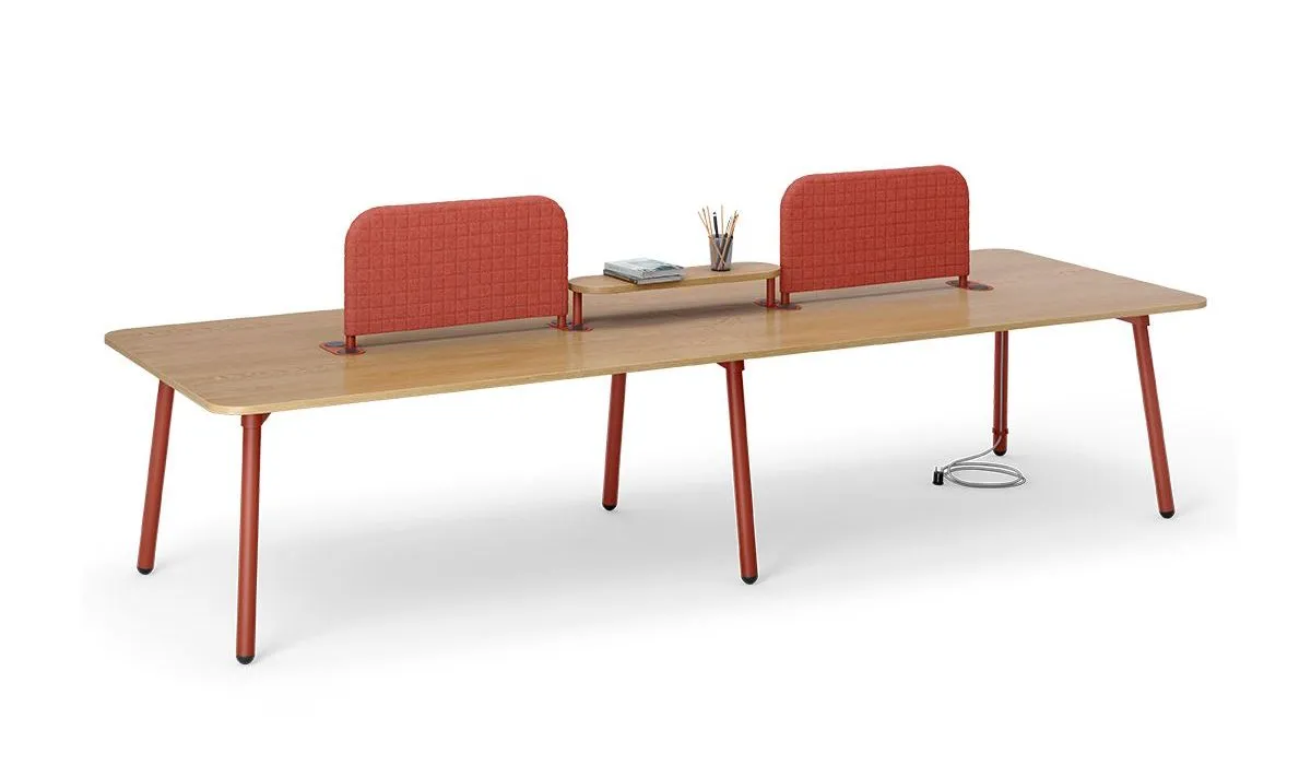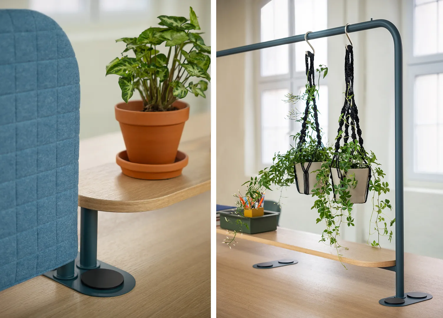 The quilted fabric desktop screen has sound-absorbing properties and serves as a screen. Raised shelves create practical storage areas and make this place to meet lively and inviting. The tubular arch is excellent for hanging plants or lamps. The legs and metal components are available in any CbM* colour, making it easy to adapt to different colour schemes.