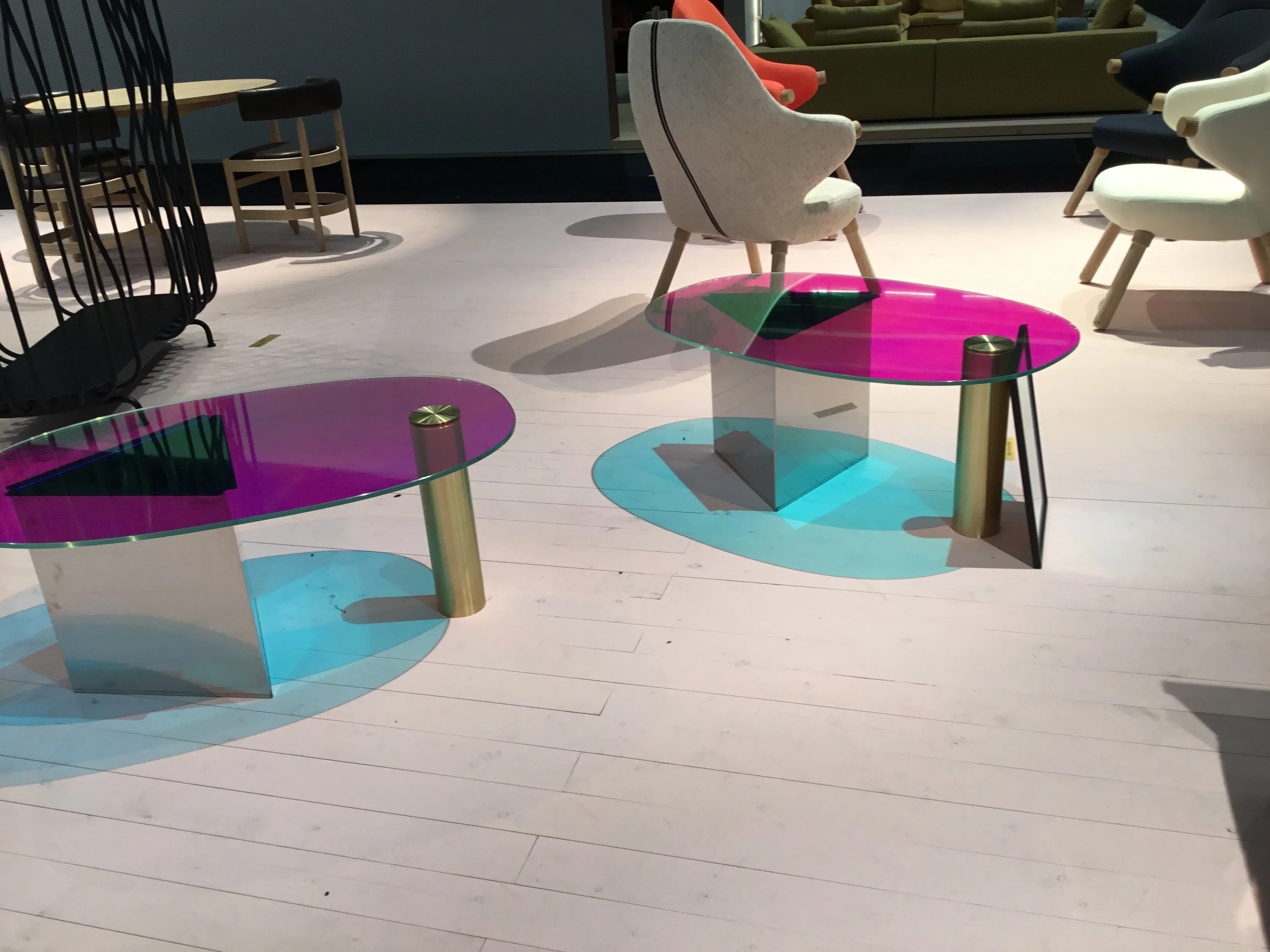 Coffee/lounge table. Dichroic glass, brass, stainless steel. Each table