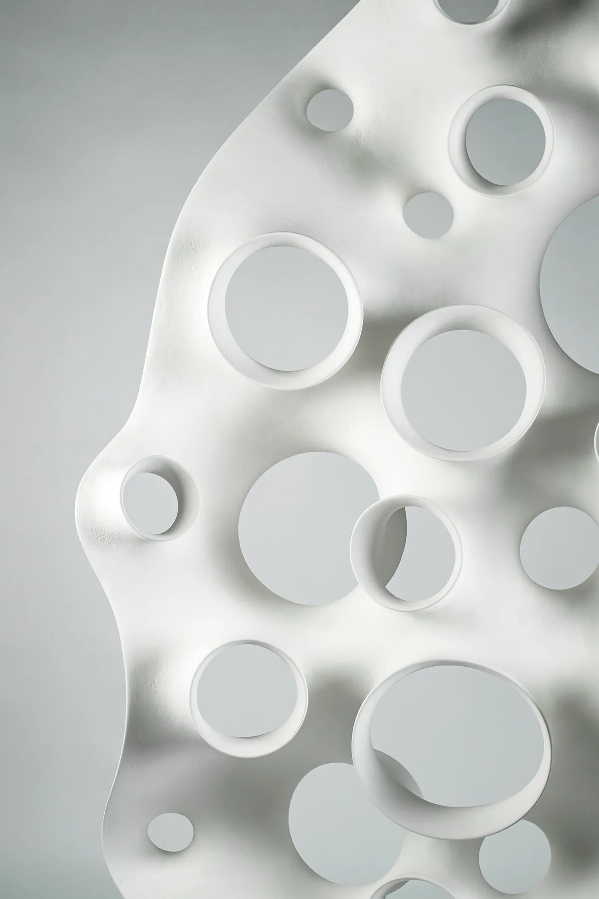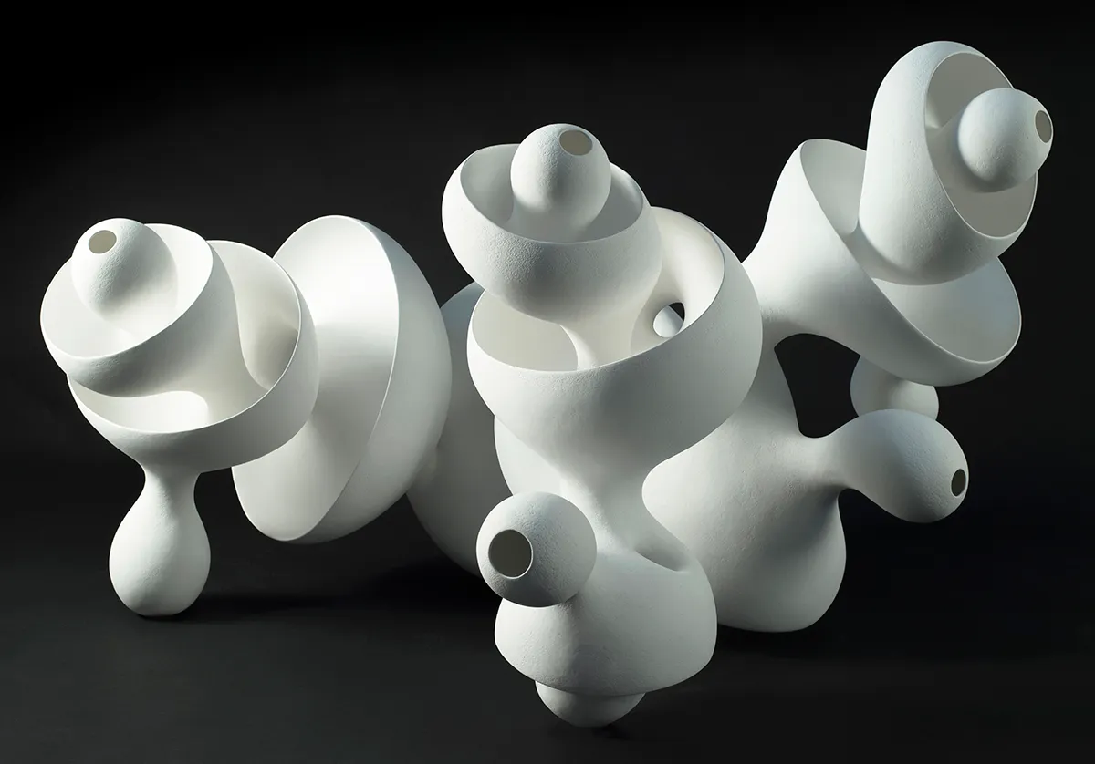 In this exhibition at Landskrona Konsthall, sculptor and ceramicist Eva Hild explores the mental image of the dissolved body. She develops and transforms ceramics and their forms in different materials and contexts. Previous works are displayed together with new ones, and white and black stoneware coexists with mirror-gloss metal sculptures in the hundred kilos class.