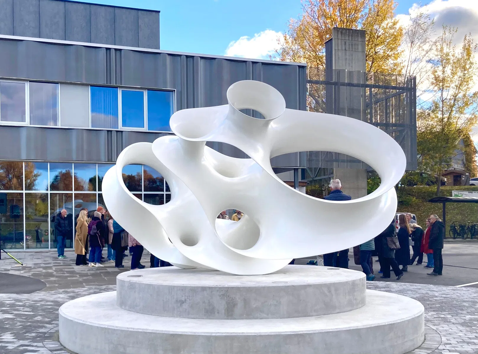 The site choice was intentional and unconventional. Rather than positioning the sculpture at the more obvious waterfront location, Hild chose the forecourt of Smia Flerbrukshus — a multipurpose community building with an almost industrial character.