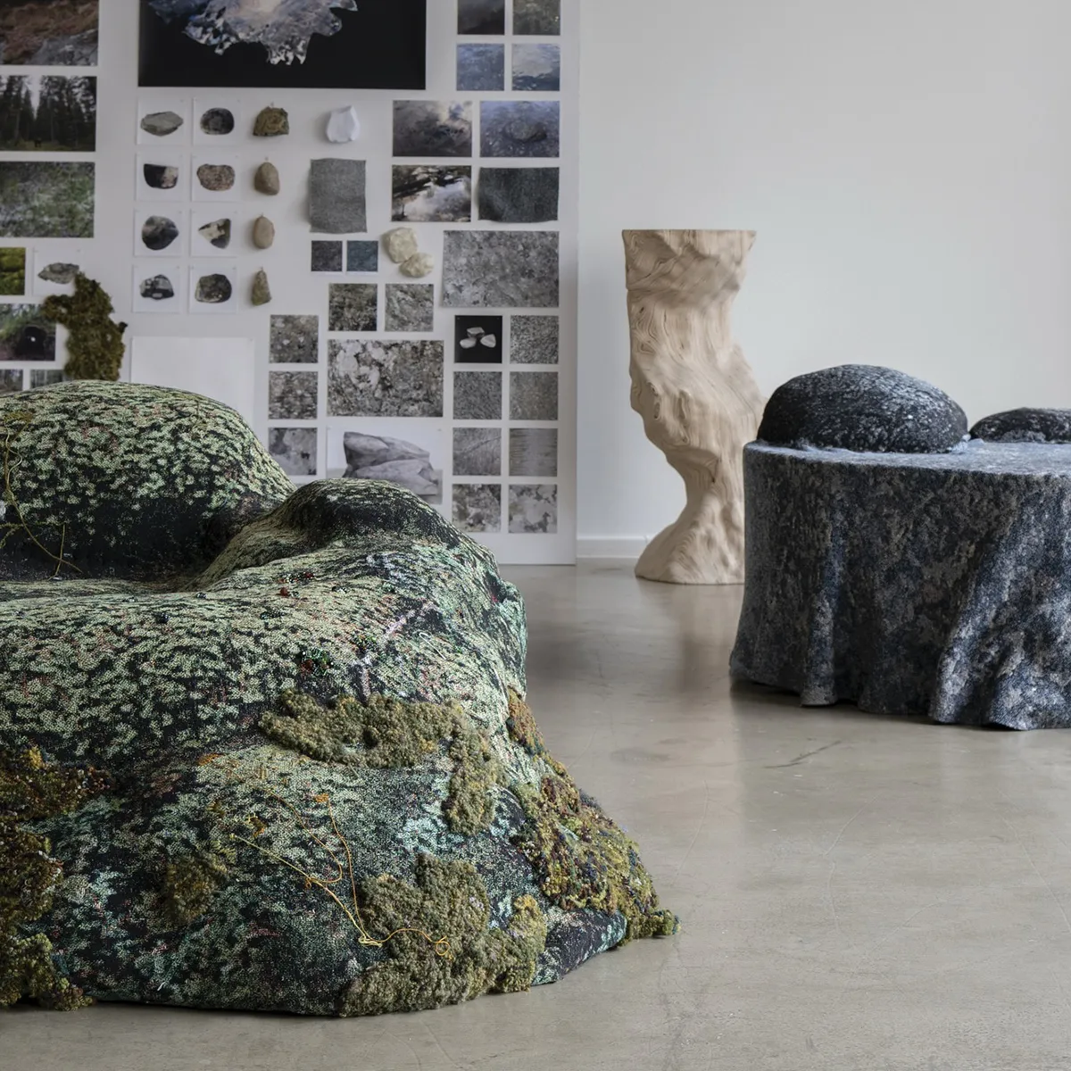Design by Nature is a project in which, over several years, Front documented places in nature and investigated creativity within the animal and plant kingdom. The documentation has, among other things, took place through 3D scanning of lakes, forests, rocks, animal tracks, iden, mosses and plants in order to be able to study and reproduce nature’s imprint as patterns and shapes. The material has inspired Front to a new series of objects and furniture created through traditional craftsmanship such as weaving, tufting, embroidery, plant dyeing and modern technology such as digitally woven tapestries. Front is one of Sweden’s most established design studios internationally. Their works take their starting point in investigations and experiments where the objects carry a story. To help them in the creative process, they have, among other things, created objects with the help of animals, through advanced technology and in unexpected materials. They have made themselves known for the now iconic horse lamp and the freehand sketched furniture in 3D.