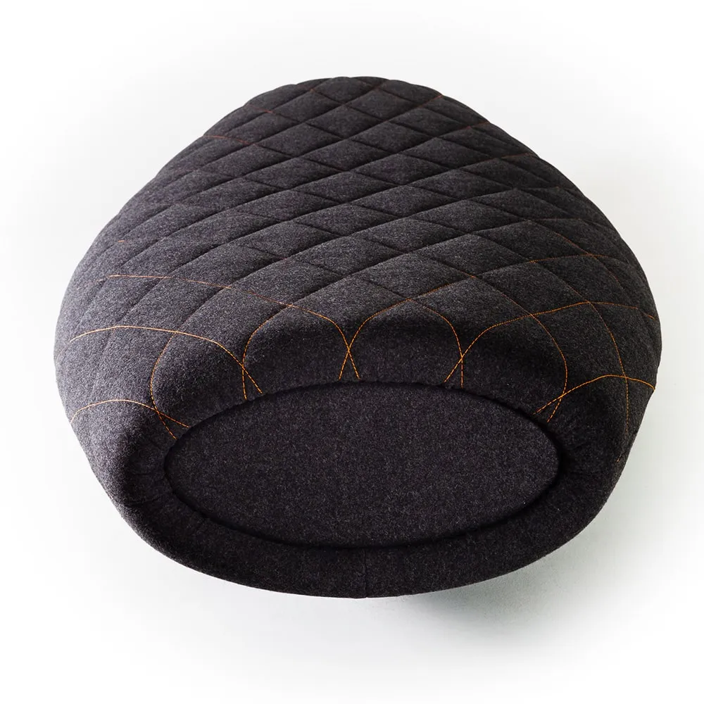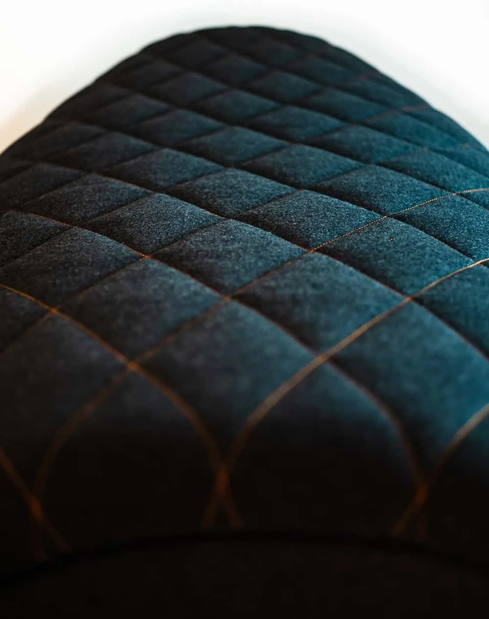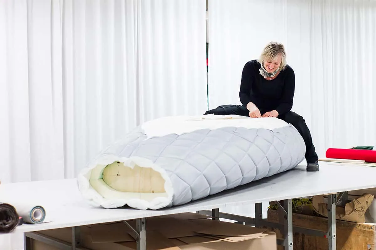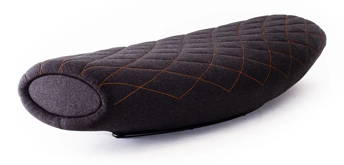 The body of Waka is barely three metres long with a broad centre and narrow ends, which gives it character and space enough for several people to use at the same time. An upholstered surface with a characteristic quilt pattern covers the structure of the furniture.