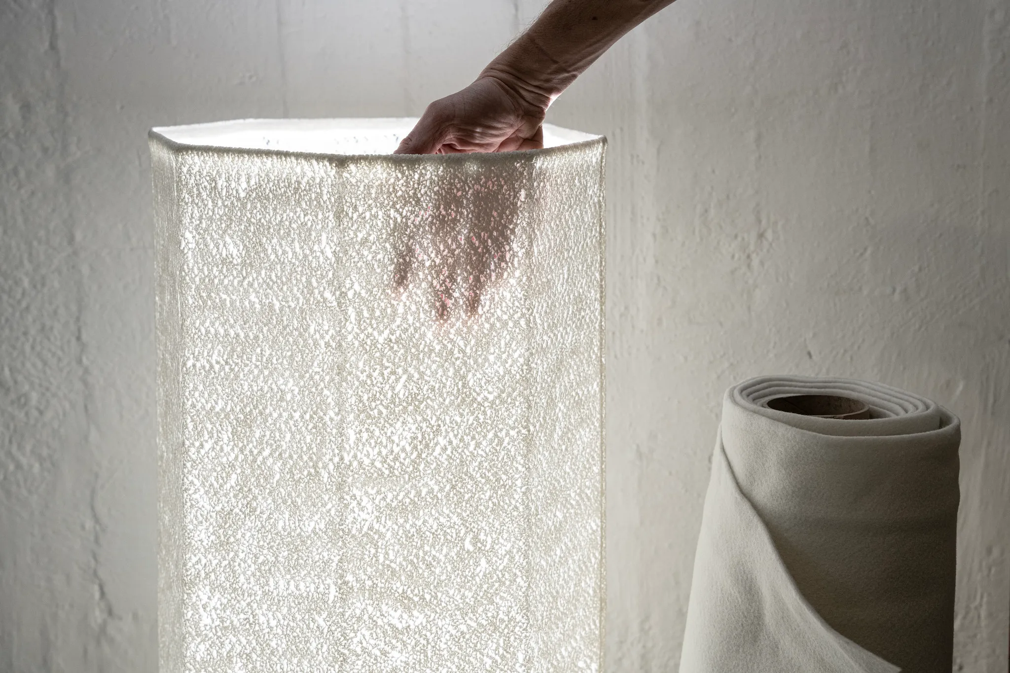 Färg & Blanche presents the Burn Lace lighting collection at Stockholm Design Week 2025. The collection, inspired by their experiments with polyester felt, demonstrates how the material has been treated with hot air to create a lace-like pattern, resulting in a poetic interplay between light and textile.