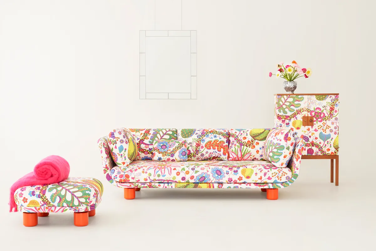 “The meeting between contemporary design and Josef Frank’s and Estrid Ericson’s classic eclecticism was the inspiration behind the shape of the sofa. The warm and homely qualities of a bed was a recurring thought, expressed in the form of the cushions. The name Famna (Embrace) refers to its generous depth and low seat height that invites you to a comfy rest with its embracing form.”