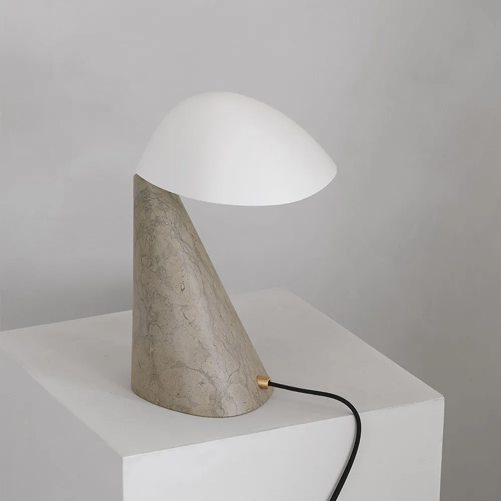 The base is made from solid limestone, which renders it visually and technically static. The limestone features a variety of sediments that add depth and attest to its natural origins. In contrast, the shade is made of powder-coated metal that is flexible. It can be adjusted to create different moods as part of the visual language, from curious when fully extended to shy when turned towards the base.