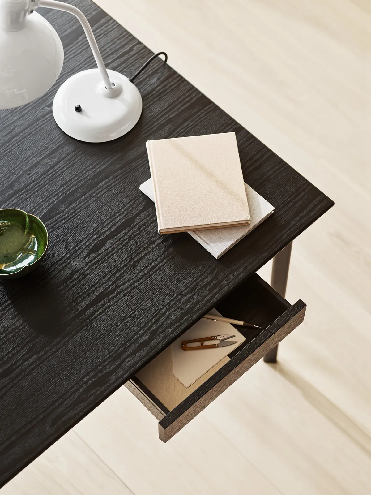 Adding the drawer, work is easily stowed away, and the table can be used for dining. The tabletop comes in two finishes: Walnut and black coloured ash.
