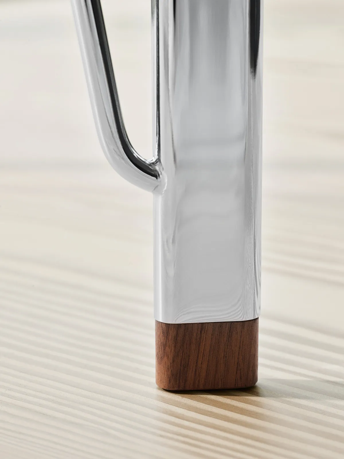 The re-designed foot will also compliment the tabletop finish in walnut or black colouredash. And the legs can be chosen in chromed steel or black powder coated steel