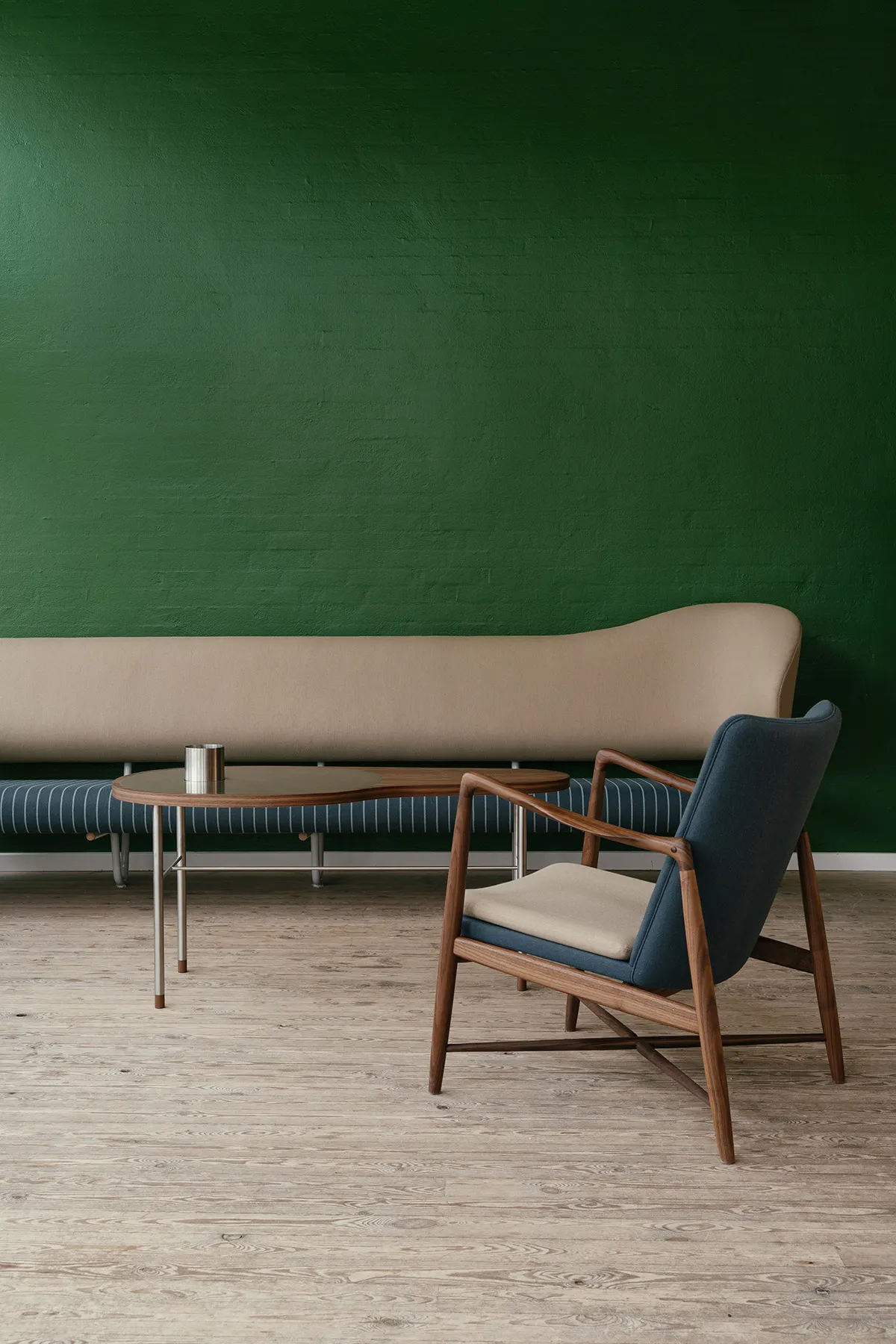 In 1951, Finn Juhl designed an extra-long version of his asymmetrical and sculptural Wall Sofa for a private villa for the timber merchant W. F. Aubertin. Now, the special edition of the Wall Sofa is being relaunched by House of Finn Juhl at the reclaimed Museum Jorn in Silkeborg, Denmark.