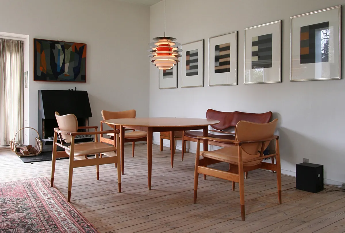 A collection of Finn Juhl’s furniture, including the 48 Chair and the 48 Sofa Bench, is situated around a circular table in the largest bedroom of the house.
