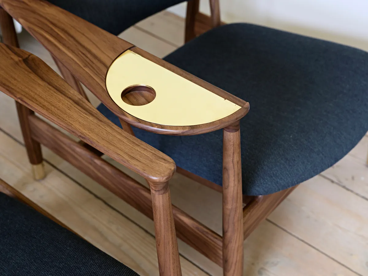 The Whisky Chair is not only extravagant, it is also playfully provocative – perhaps even borderline politically incorrect. The right armrest unfolds organically towards the end, making way for a handmade half-moon shaped brass tray. The tray can unfold into a full circle where a hole in the brass surface is shaped to hold a glass. Finn Juhl’s original watercolour drawing (included further down) from 1948 shows how two chairs fit perfectly together, as the right and left armrests are asymmetrical.