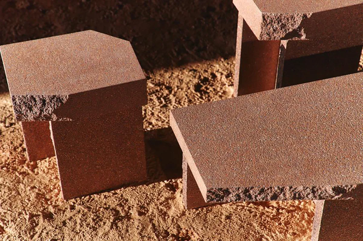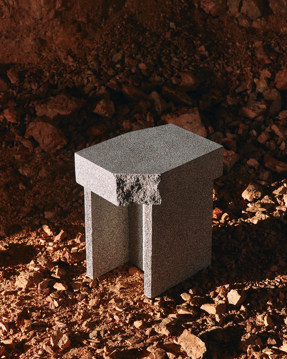 “This is a completely new material with a fascinating appearance,” explains Förster. “We worked with the material as the project’s starting point, which is what led us to create a brutalist furniture piece. But we ended up softening that by breaking off the corners. The breaks are done by hand, so no two tables are identical.”
