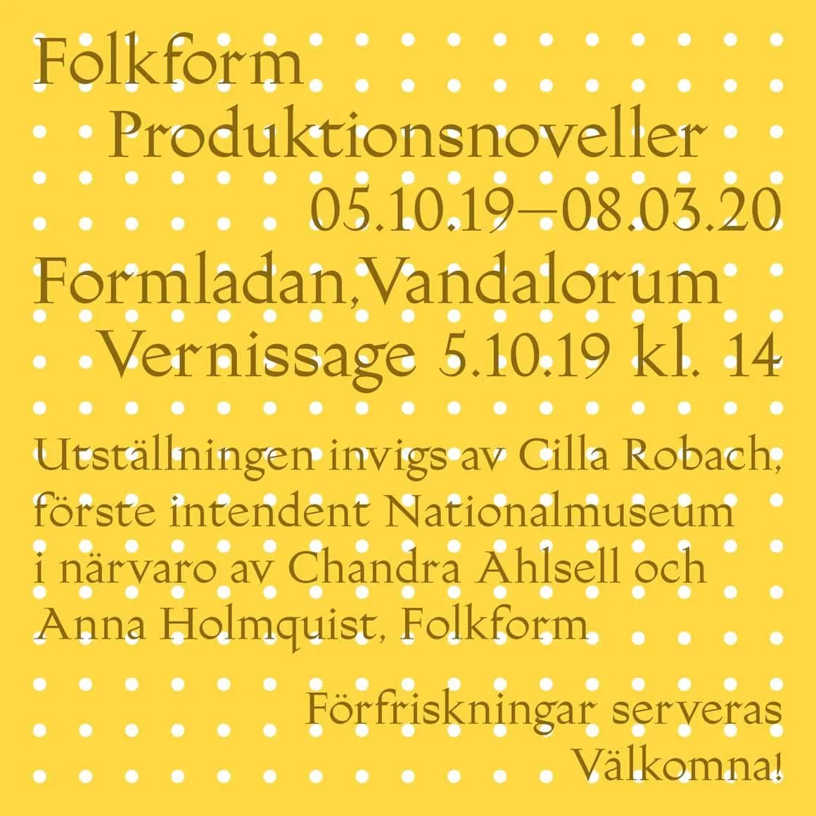 Vandalorum kan i höst med stor glädje presentera designduon Folkforms största soloutställning på en svensk institution. Folkform utgörs av Chandra Ahlsell och Anna Lovisa Holmquist som i år tilldelats Bruno Mathsson-priset, Nordens största designutmärkelse. Den omfattande utställningen fyller Vandalorums Formlada och visar Folkforms experimentella produktion från det senaste decenniet – genom själva föremålen men också genom texter, reflektioner och dokumentation från tillverkningsprocesserna, sk produktionsnoveller. Genom dessa berättelser försöker de fånga en kunskap som annars skulle kunna gå förlorad. Denna dokumentation är också del i Holmquists doktorsavhandling inom konst- och hantverksforskning på Konstfack och utställningen kommer att sammanfalla med hennes disputation i februari. Till utställningen presenteras en ny katalog och ett urval av produktionsnoveller.