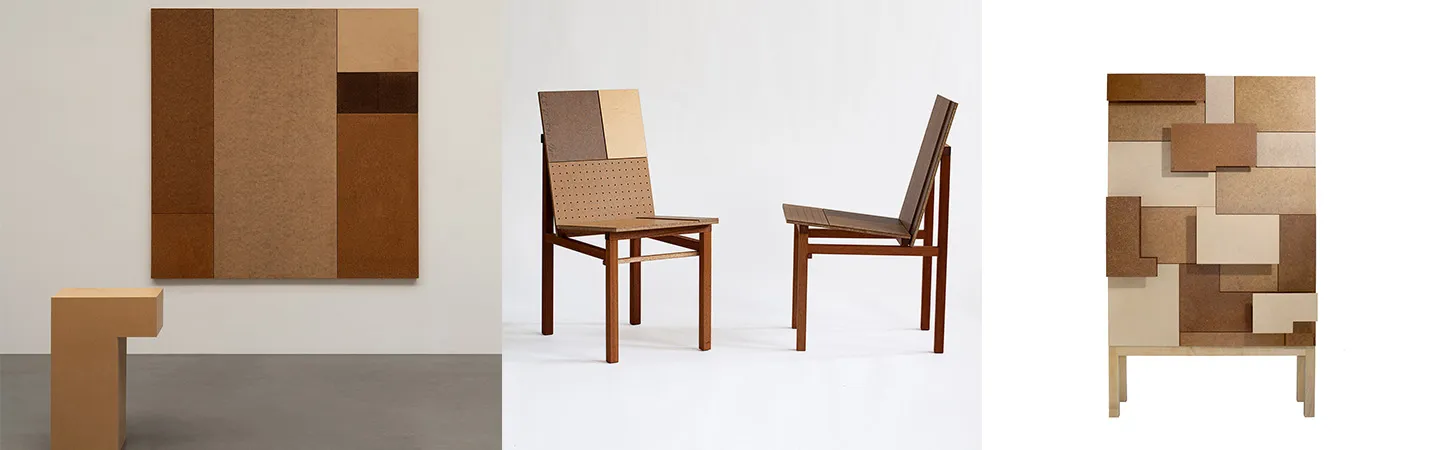 To build a product, Anna and Chandra work very closely with manufacturing processes. Their Masonite boards, for example, see them invade the chipboard production line to add an element of the hand. They scatter organic matter onto the wet composite boards, so once pressed, a series of “quick fossils” are formed.