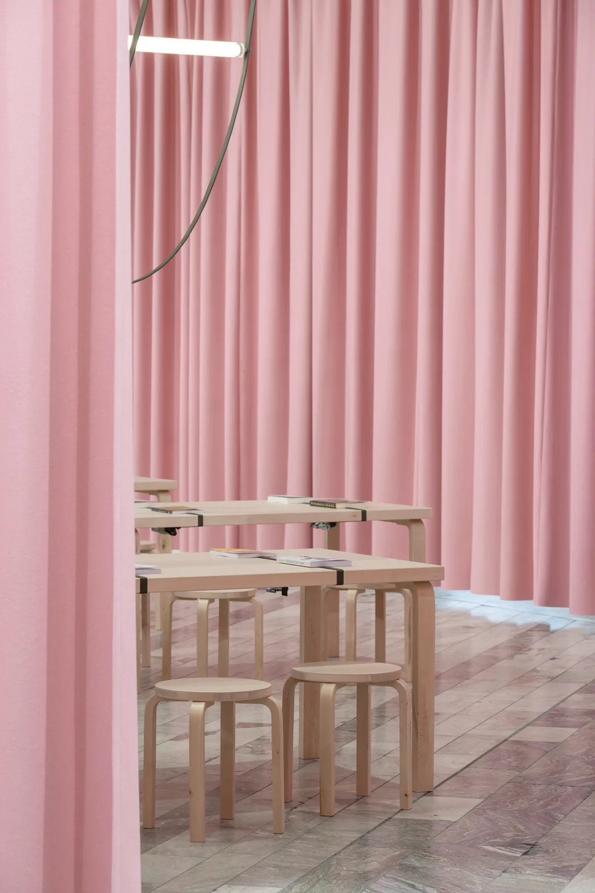 The research-based design studio Formafantasma is Stockholm Furniture Fair’s Guest of Honour 2024 and presents a site-specific installation for visitors and exhibitors. The so-called Reading Room offers a calm space of respite to sit and read, reflect and immerse oneself in the ideas that have shaped Formafantasma’s work. It is furnished with the Forest Collection, developed by Artek in collaboration with Formafantasma, and features Alvar Aalto’s tables, stools and benches made of wild birch. To ensure a meaningful afterlife for the products, each piece of furniture has been numbered and signed by Formafantasma and will be available for purchase after the fair.