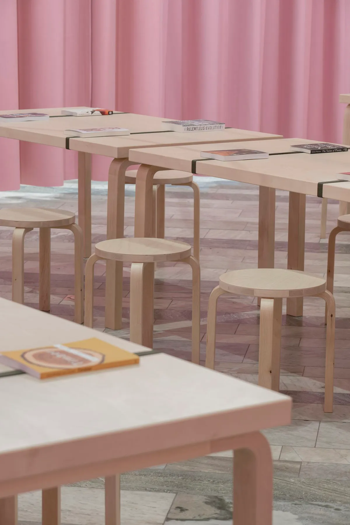 First introduced with Stool 60 in September 2023, this beautiful and sustainable wood selection is now being applied on additional Artek products to form a Forest Collection, unveiled at Formafantasma’s Reading Room. While the four-legged Stool E60 is available now, the full collection tables, chairs and benches and will follow in September 2024.