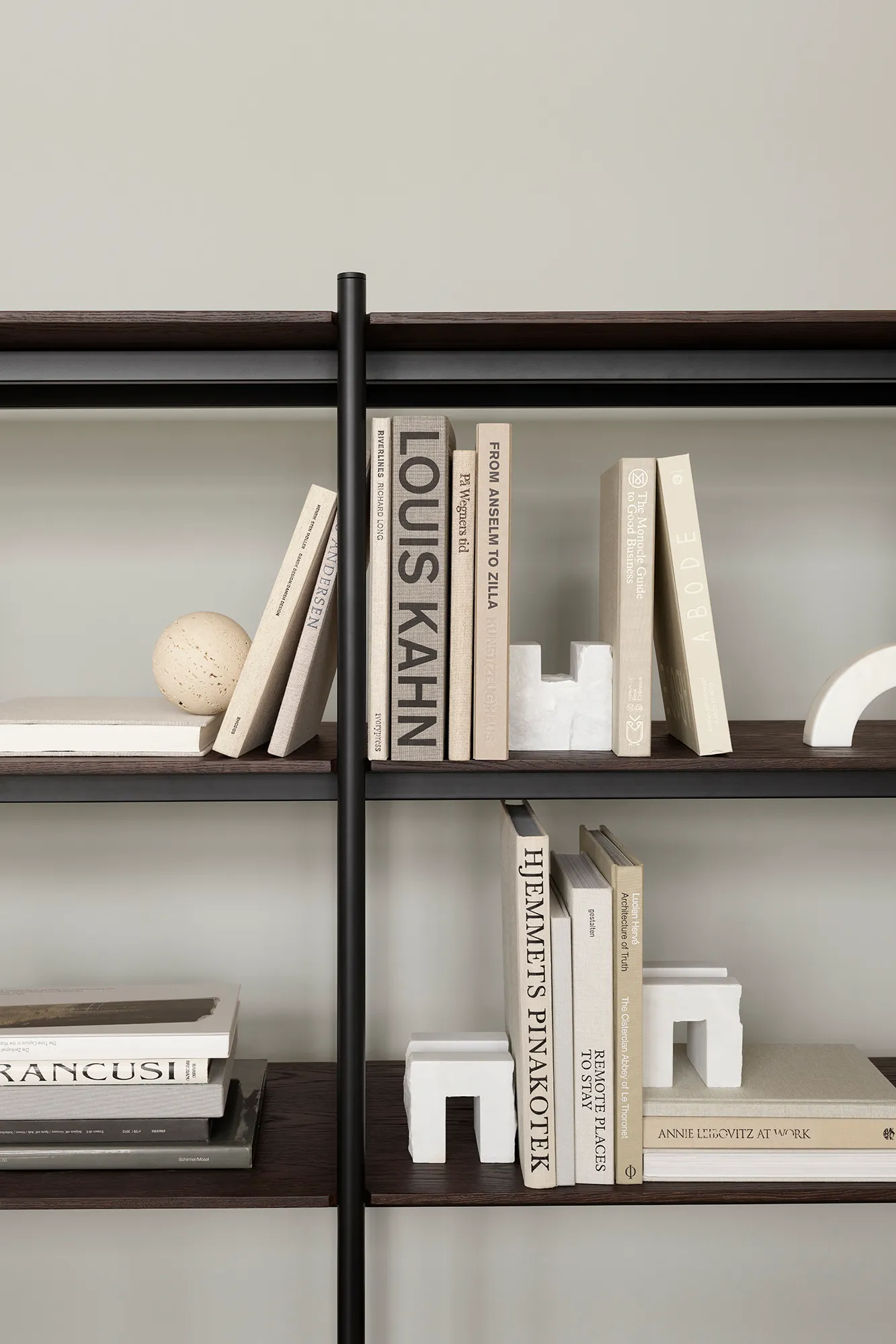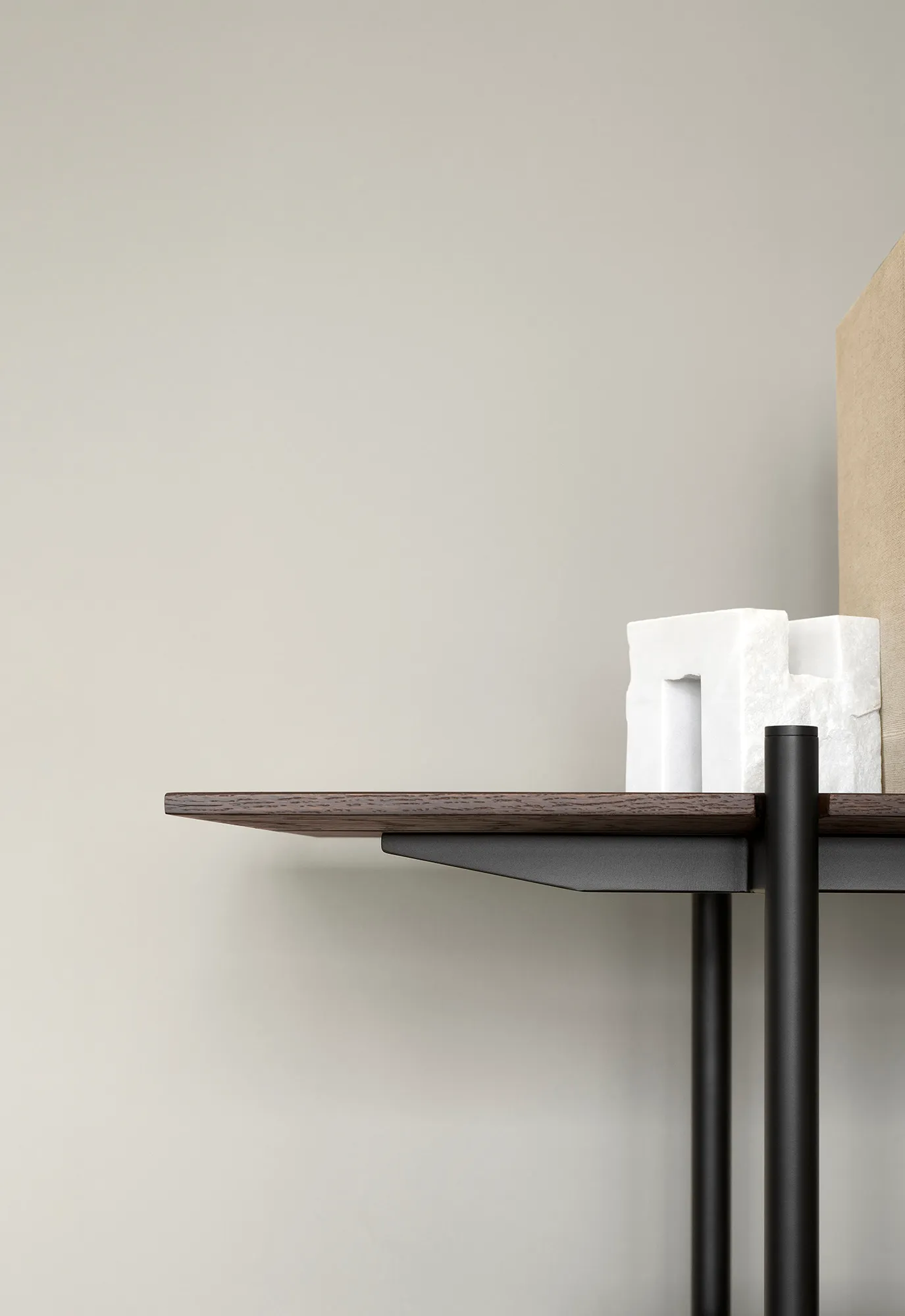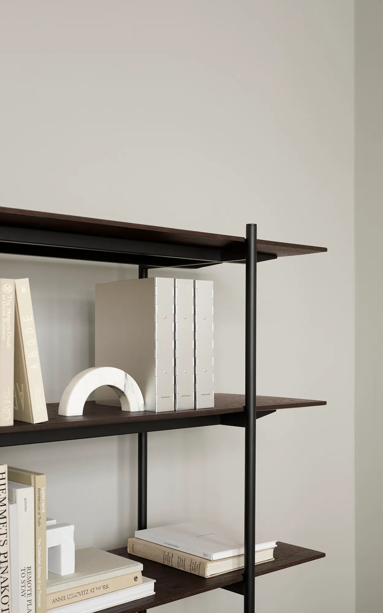 Framing and supporting the slim shelves in brown stained oak veneer, a structure consisting of horizontal and vertical trussed poles in black powder-coated steel creates a sturdy grid with subtle joints. The bevelled details on the end shelves add lightness to the design that can be combined and scaled, even at varying heights to create a more dynamic assembly. While offering a sophisticated storage solution, the system can be placed against a wall or as a freestanding room divider, creating a formal structure and a visual attraction within larger interior landscapes.