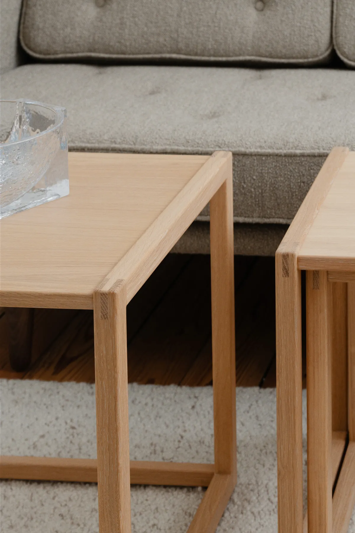 Originally a part of Graversen’s private residence, the Nesting Tables carry a rich narrative of form, functionality and beauty. Despite their slender build, the tables create an impressive cubic form, radiating solidity and minimalist elegance. The design, consisting of three tables crafted in oak, offers unparalleled flexibility as they can be used individually or combined to create an impressive coffee table adaptable to suit the surrounding space and layout. When used together, the tables offer a sculptural presence that enhances the interior.