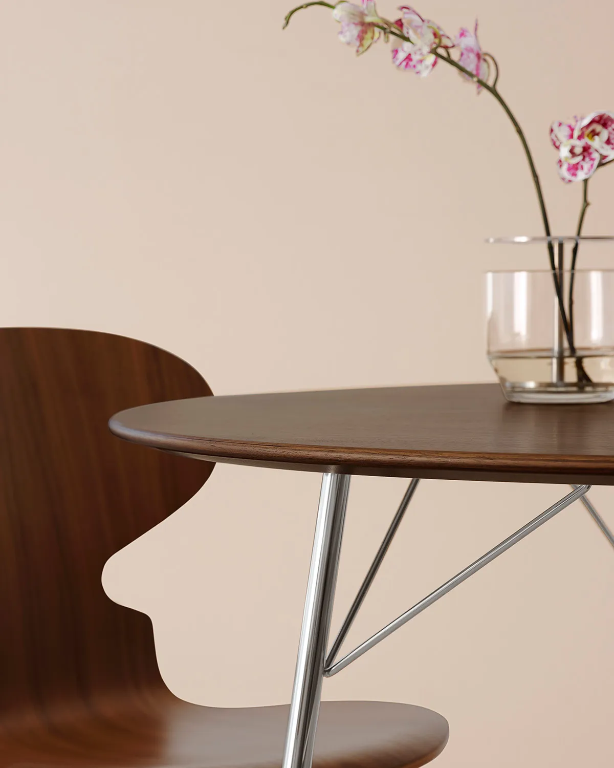 Originally crafted in teak and rosewood, the elliptical table is now offered in FSC-certified walnut veneer. Resting on three polished chrome legs, the organic shape of the tabletop ensures a relaxed and intimate seating environment where no two individuals face one another directly. It is shaped to perfectly accommodate three, three-legged Ant chairs, yet has room to comfortably seat more. Equally purposeful as an informal kitchen or dining table in smaller spaces as it is as a home office desk, the Egg table fits seamlessly into any setting, raising the bar for our daily rituals.