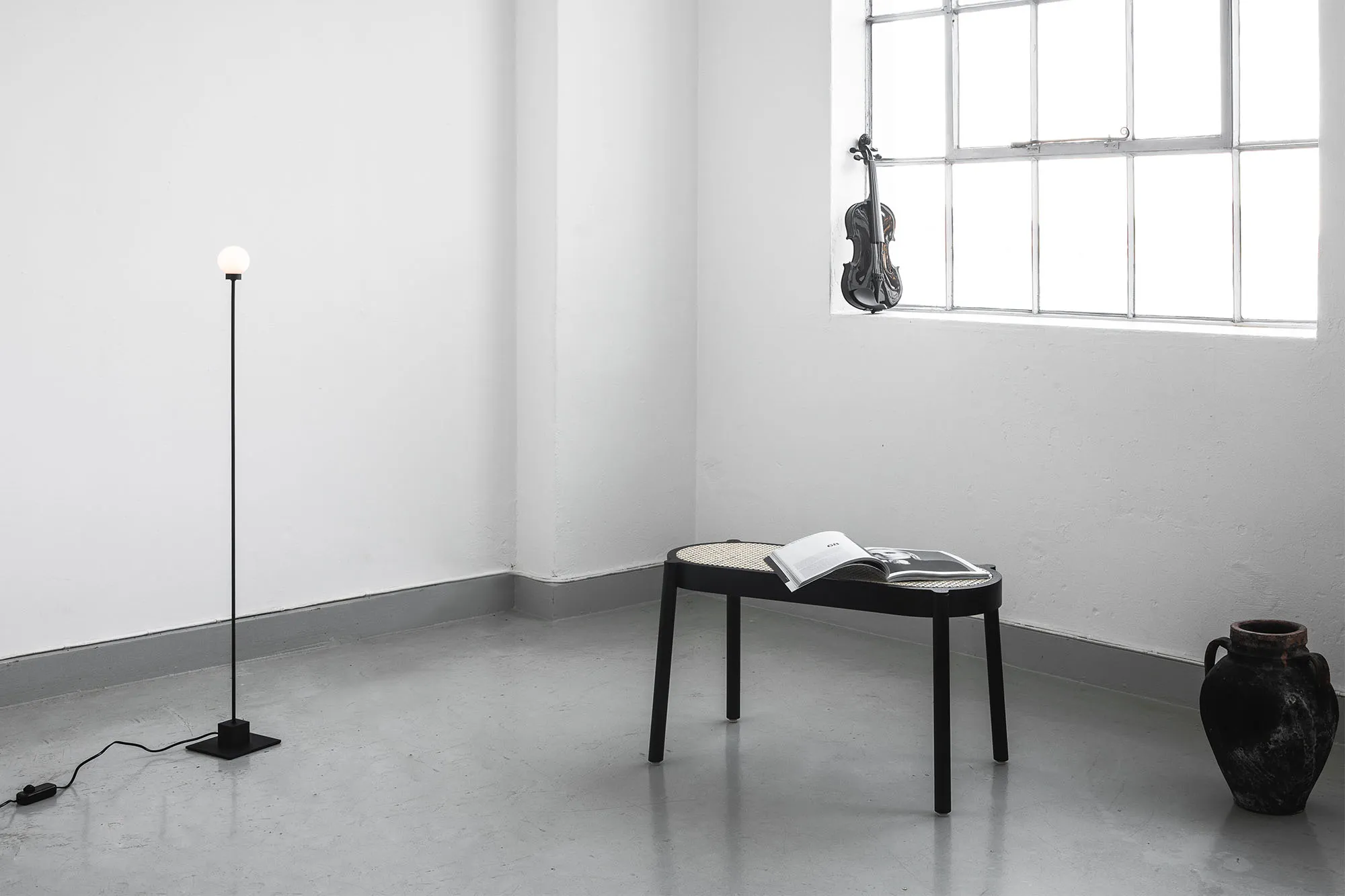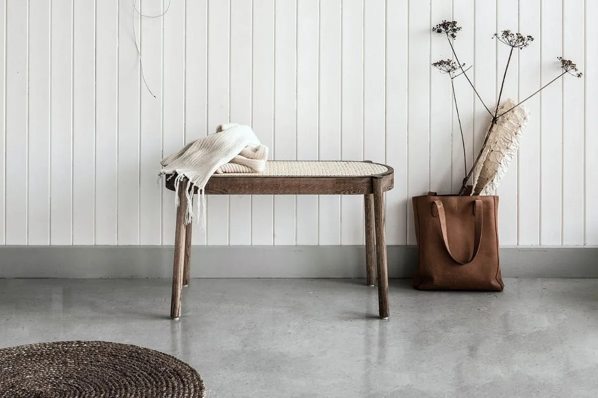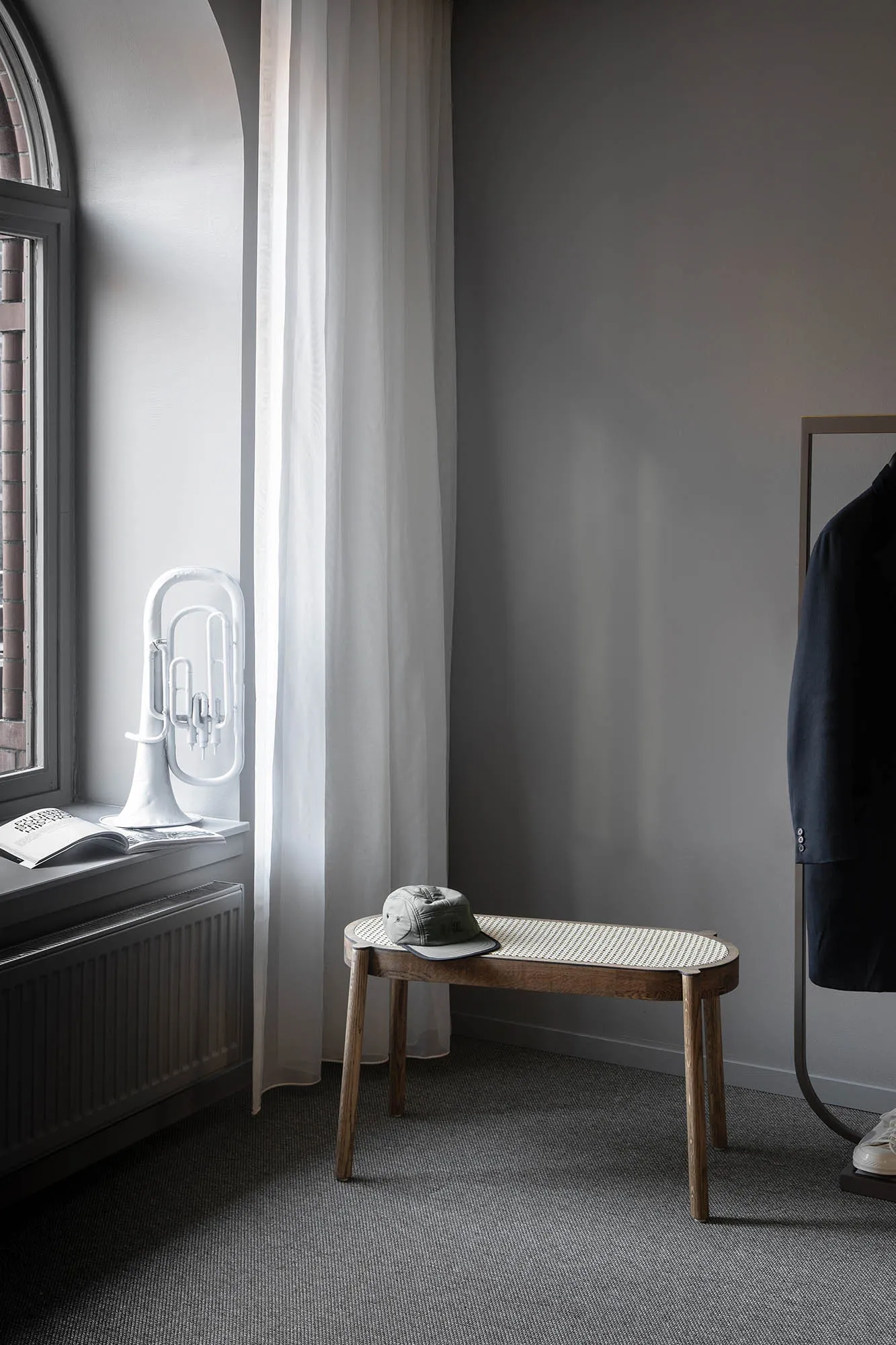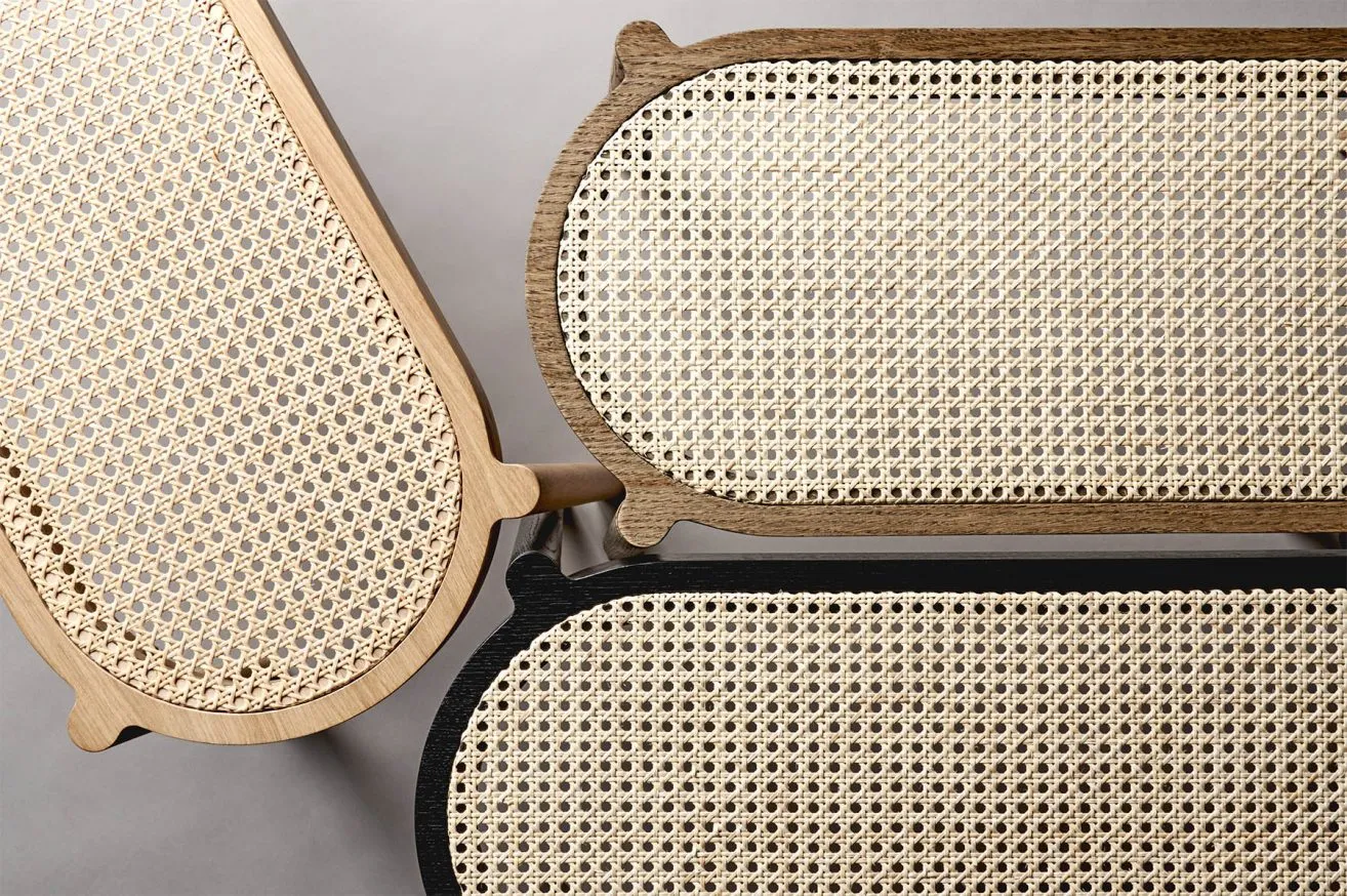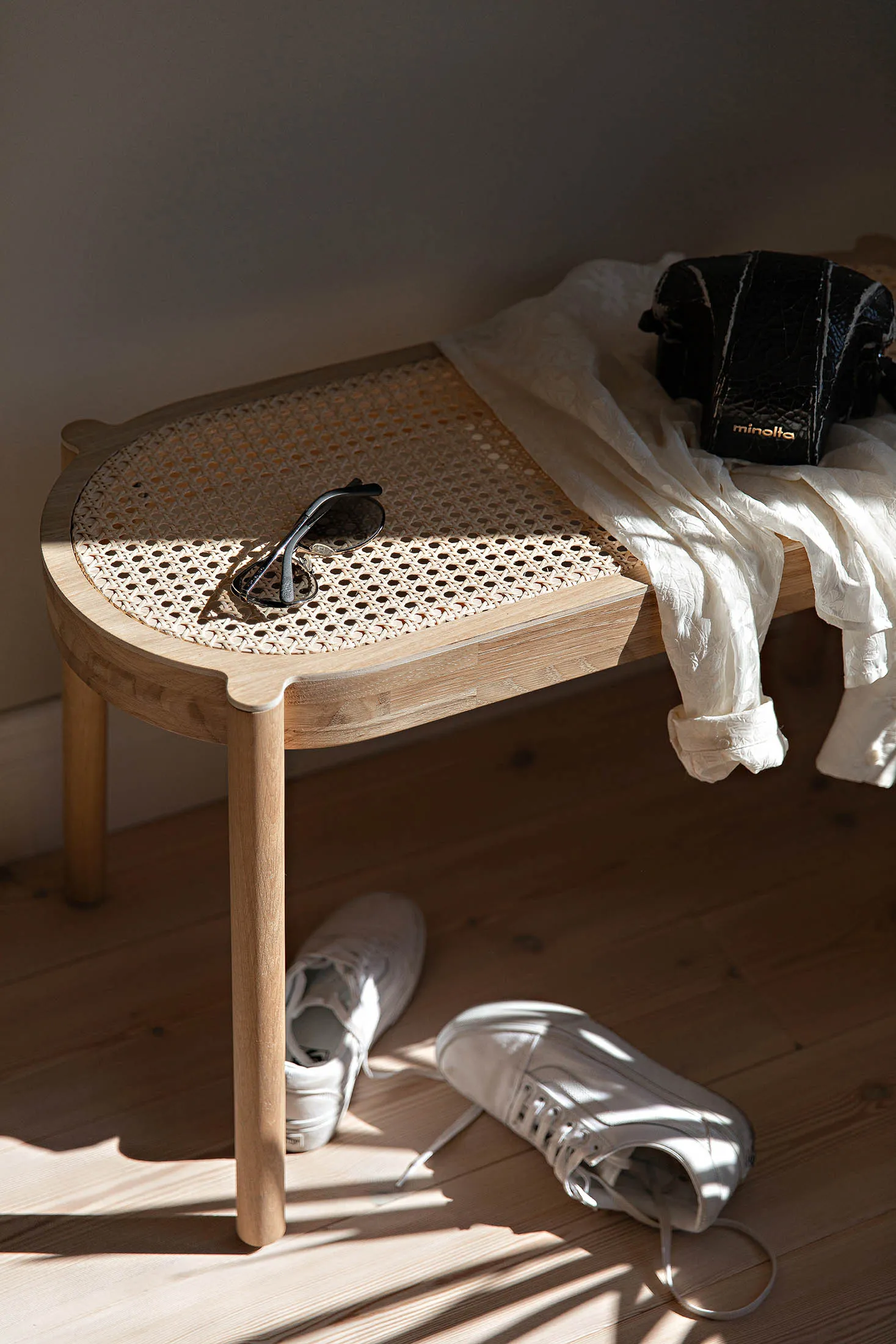 This four legs bench is filled with character, natural materials, and striking craft techniques. This year we introduce a companion bench to the existing Pal stool series. By adding length and a leg we expanded and changed the functional purpose from a stool to a bench. The wicker seat is woven from natural reed fibres and integrated into the frame to sit level with the surface. The supporting frame is available in light oiled oak, black painted oak, and smoked oak.