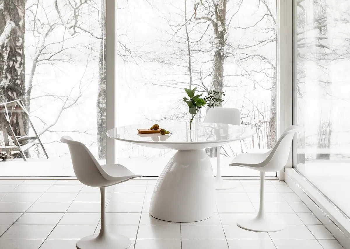 The PARABEL TABLE is made of fibreglass. There are only few such long lasting and easy to care materials to meet the needs of a table surface. The Parabel Dining Table has a diameter of 130cm and gives room for at least six chairs. At the same time when he designed the Parabel Table the Focus Chair took shape in Aarnio’s mind. The combination of these two models show the spirit of Eero Aarnio’s designs.