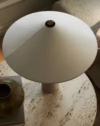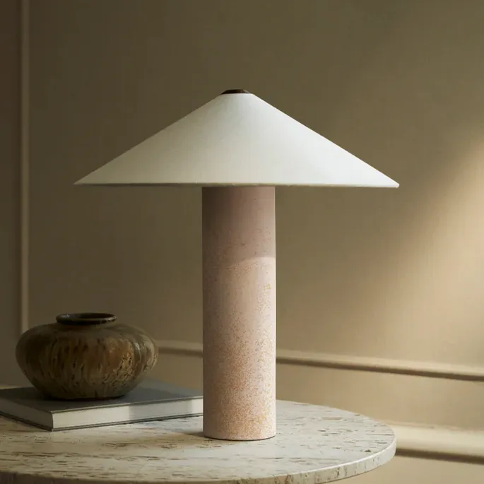 The FUTÉ lamp, with its soft textile shade, gently diffuses light, spreading a warm and inviting glow throughout the room. Designed to create a welcoming atmosphere, this delicate diffusion of light adds a touch of elegance, perfect for creating an ambient setting.