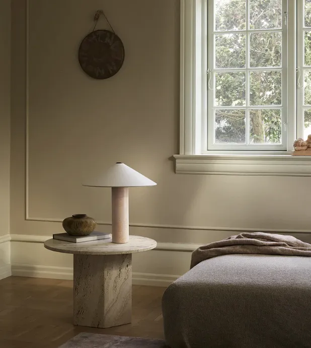 The design by GamFratesi blends elegance and functionality with a versatile structure that complements any setting, whether adorning side tables or shelves. Its thoughtfully placed metal detail not only serves as a technical element, seamlessly connecting different parts of the lamp, but also doubles as a convenient switch.