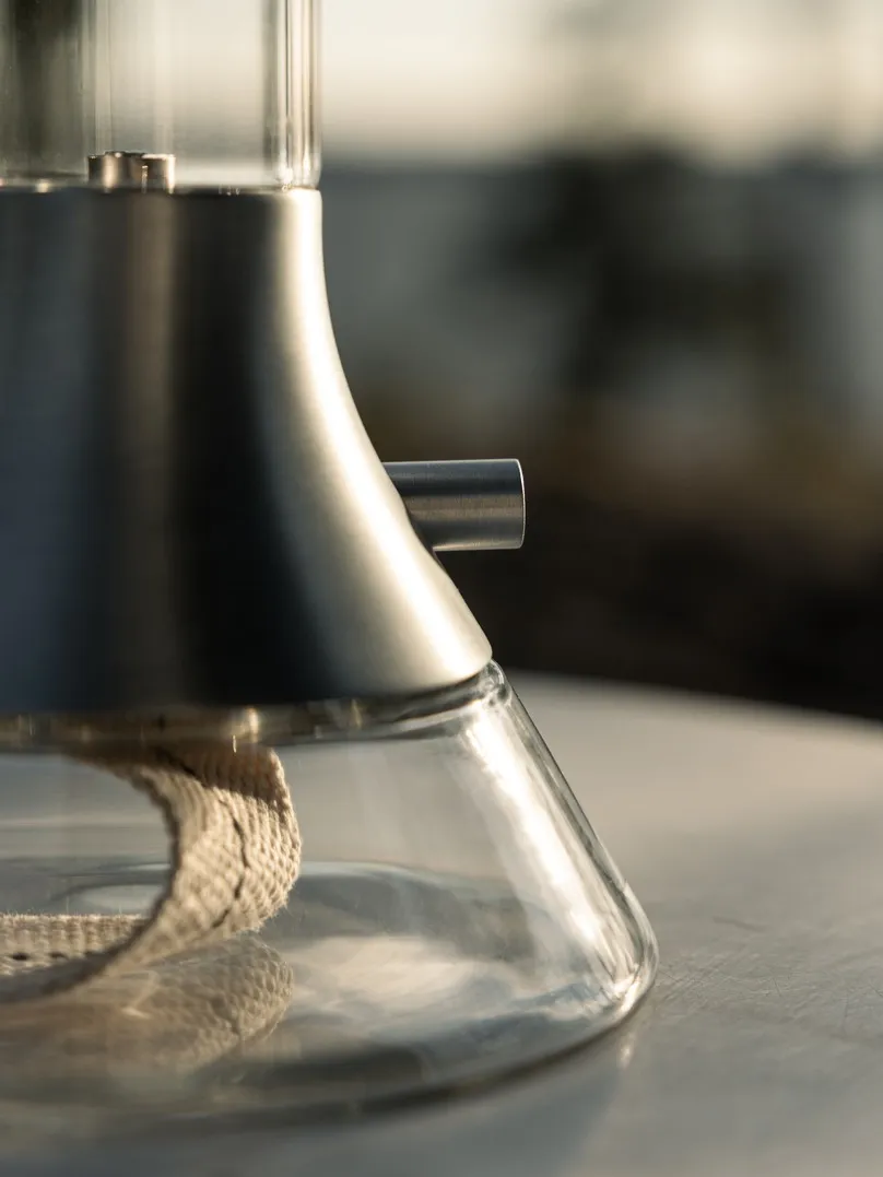 A sizeable cone as a base, a sturdy waist for the tubular wick, and a cylindrical glass chimney for the burning flame. Johan Larsvall reduces the classic kerosene lamp to its essentials: no superfluous decoration but full-on industrial abstract simplicity. Fyr Kerosene Lamp is a testimony to by-gone eras and memories of dancing flames in the evening light. Use Fyr Kerosene Lamp as a both gentle and strong live light indoors. Or let the lamp glow steadily outdoors and chase away the shadows in the evening breeze. The 16-centimeter-wide fount will stay firm on any table, and the lamp has an impressive height of more than 30 centimeters. Use the stout yet slender knob to adjust the flame and to tilt the lamp up for a grip when moving it around. The glass fully transparent base shows the amount of remaining lamp oil and let you control the travel of the wick when turning the knob. ‘I wanted to create a modern take on the classic kerosene lamp which hasn’t evolved for more than a century.’ says Johan Larsvall. ‘I have reduced it to its basic forms: the cylinder attached to a slender waist that expands to grip the conical base.’