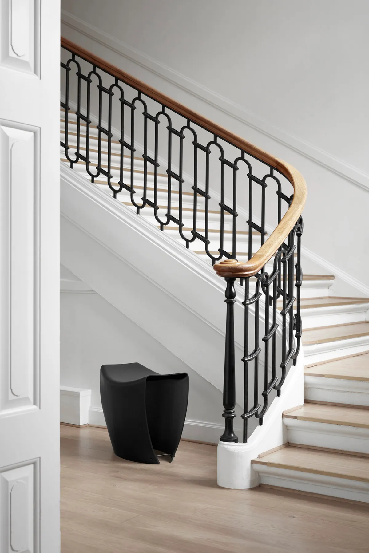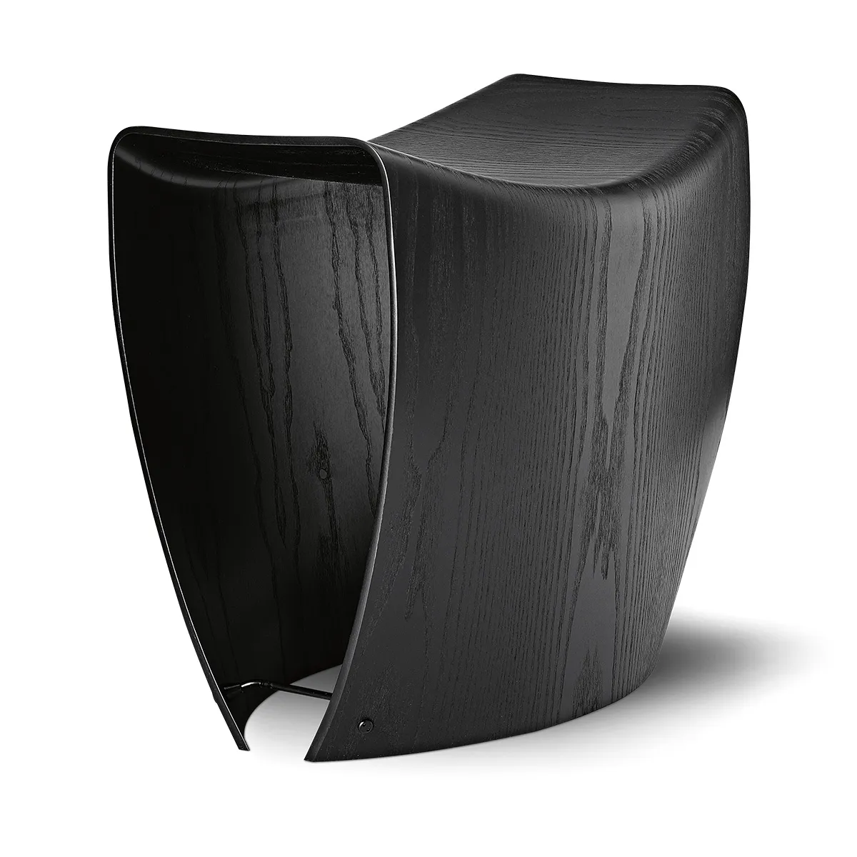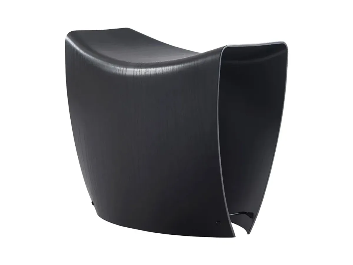 The stool is made from a single mould of plywood and fixed with metal joints, demonstrating the designer’s mastery of material engineering and minimalist aesthetics. The design features ten layers of plywood cut out in a 53 cm x 125 cm rectangle and stressed to the limit of the material’s capacity, with no front or back orientation – you can even sit astride it.