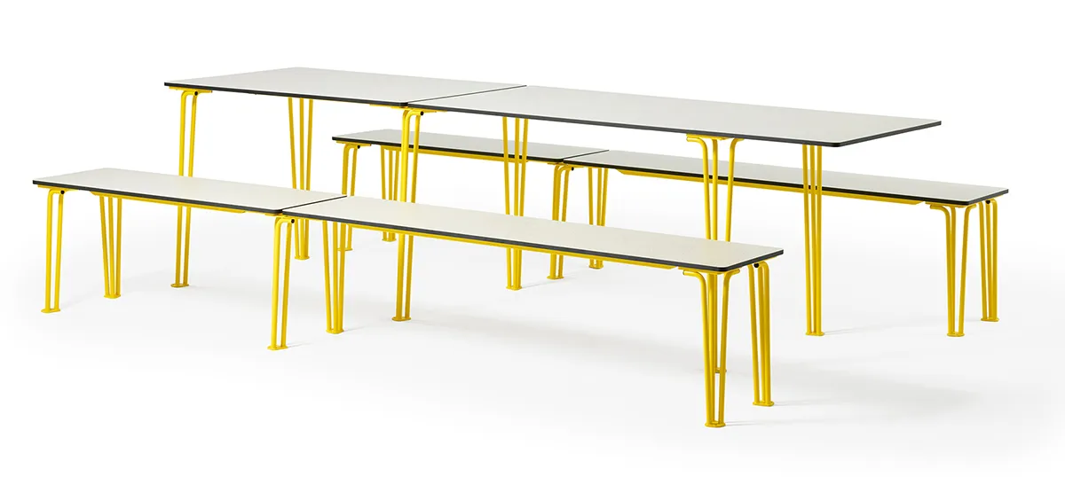 Gard table and bench are now available in highly durable laminate, still in the same distinctive style. Their frames recall the sleek wire furniture of the Mid-century period, contrasting lightweight metal rods with solid tops. The long version of the table can be delivered with an extra 40 cm in length to provide extra accessibility to wheelchair users. The table and bench are also slightly taller than industry standards. Together, the table and bench are a natural choice for food courts, cafeterias and residential care facilities, indoors as well as outdoors.