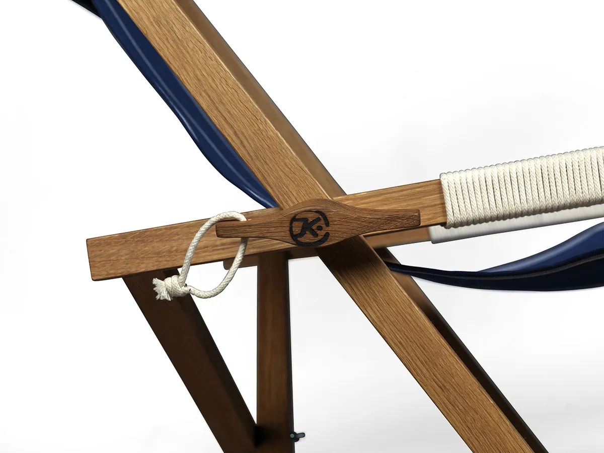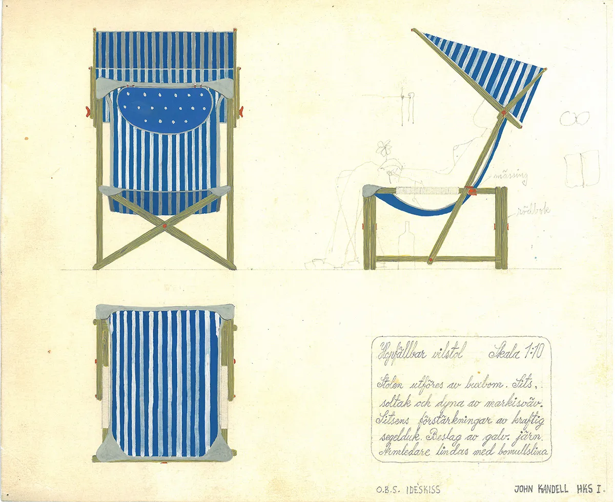 Frame in oiled oak, sunshade seating and roof. Adjustable sunroof, wrapped armrests with cotton rope. Examination work by John Kandell at HKS, 1947. Designed after the original sketch.