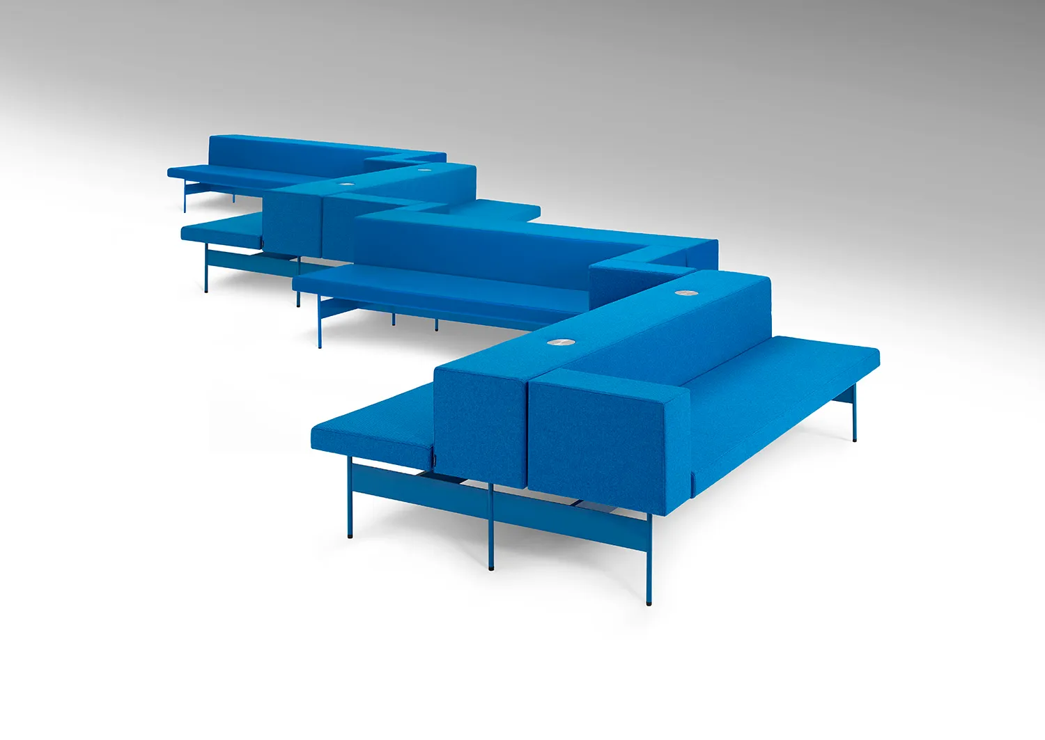 The seat is thin and the backrest is thick with electric sockets conveniently placed on top. This creates an unconventional silhouette were the backrest also functions as a new and useful space for placing your belongings such as your laptop. Gate is constructed almost like building elements that easily can be assembled after need. The sofas angular end pieces are all the same, which means it may be adjusted in different lengths without requiring specifically designed end pieces, making it a dream for any architect planning an interior.