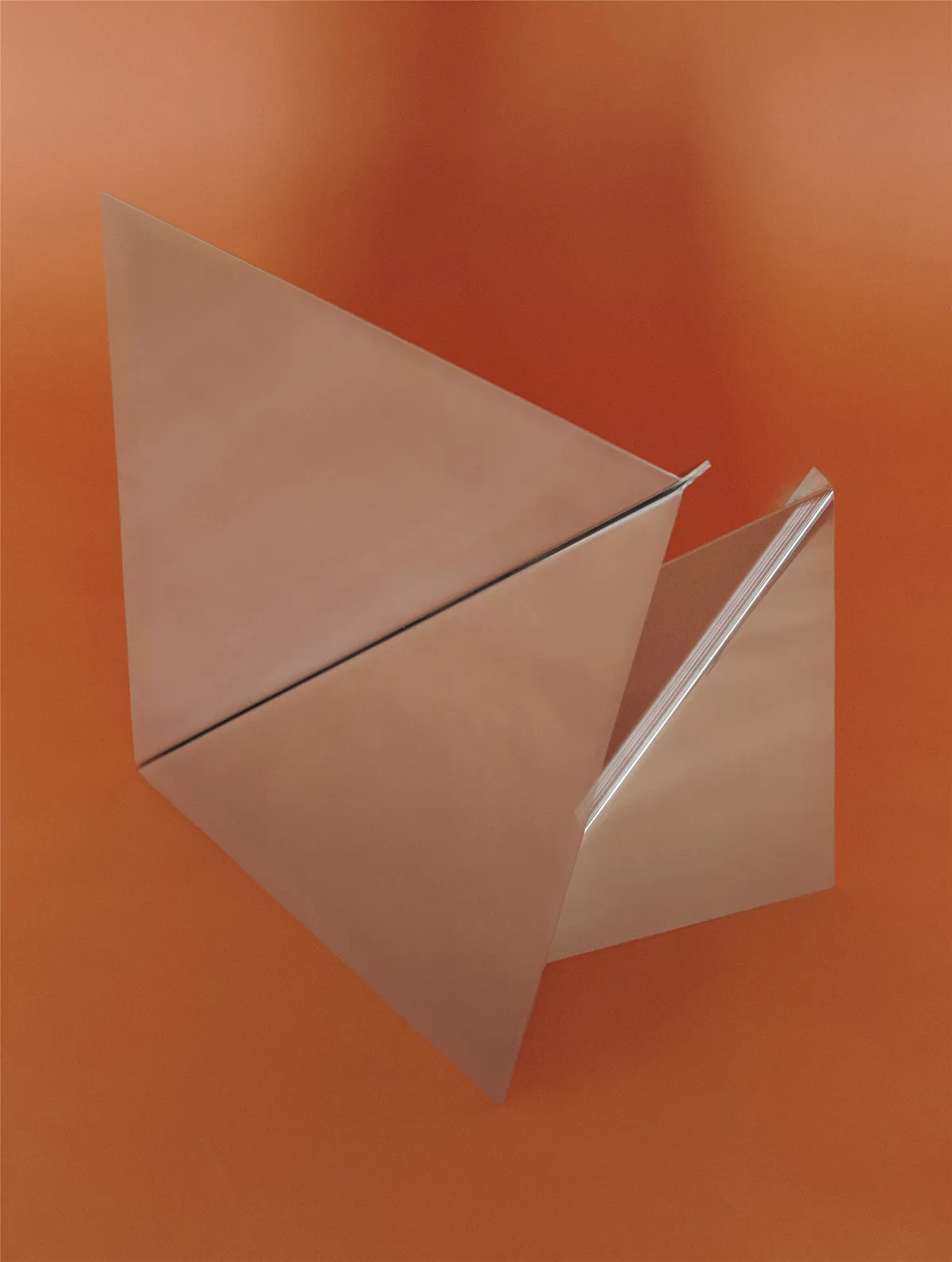 “It all started with the material. Stainless steel can be polished to a high-gloss, mirror-like finish. Interestingly, it is akin to a mirror without being traditional glass with a silver backing. It’s just a single material, which makes the construction minimal-only a few components are needed. We use folding a lot in our work because it allows for thin, visually light, and structurally strong pieces,” says Phil Procter.