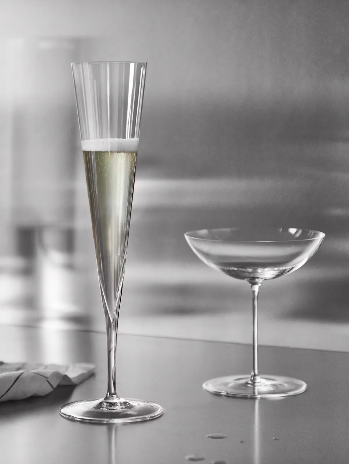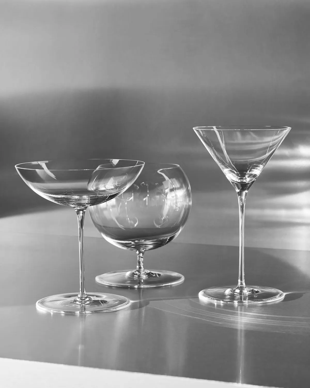 Each piece in the 12-part collection is a study in pure form, where spheres, cylinders, and cones merge to create an unmistakable silhouette. The series spans from generous red wine glasses (72cl) to delicate snaps glasses (6cl), with every piece mouth-blown in Orrefors’ signature thin, light crystal.
