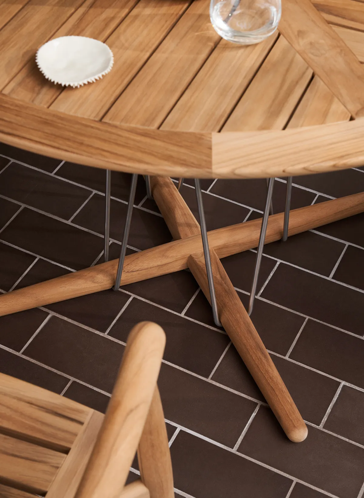 The dining table has a light look as if it is floating. Inspired by the poetic dance of the kites across the sky, the playful wire construction of the frame draws parallels to the kite’s tether, with the crossed wooden base functioning as an anchor. The round tabletop comprises 50 pieces of solid teak assembled in a classic daisy pattern to the highest degree of precision.