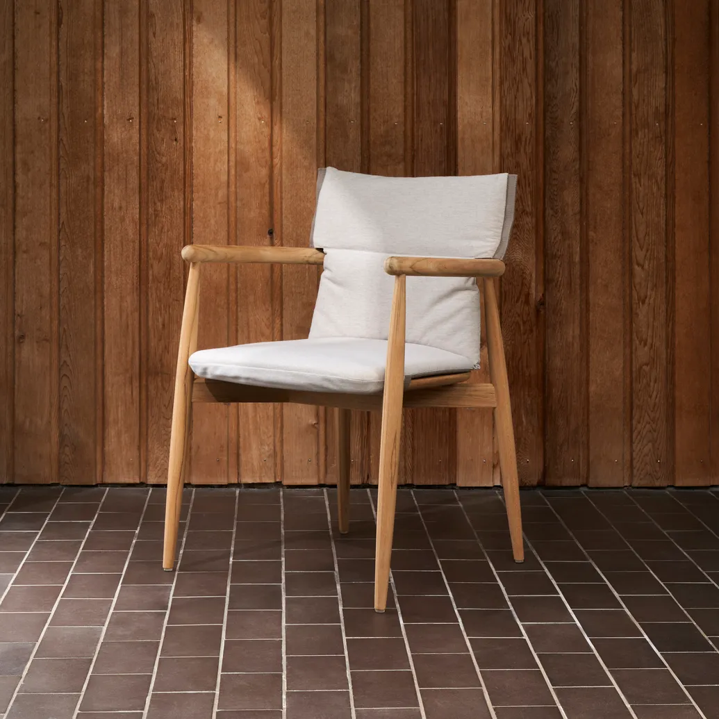 With the Embrace Outdoor Chair, EOOS has created a highly finished wooden frame upholstered with an informal, soft cushion that creates an elegant contrast against the sleek wood. The designers have strived to create a new typology for outdoor furniture, as the chair is almost fully upholstered and ultimately resembles a piece of indoor furniture. The chair can also be used without a cushion, giving the untreated teak a more prominent role. The wooden frame, which is sanded and assembled by hand, is made to precise standards of craftsmanship and boasts several functional details, such as finger joints on the armrests and a truss assembly under the seat, which increases the stability of the chair while looking beautiful from every angle. The chair is also stackable.