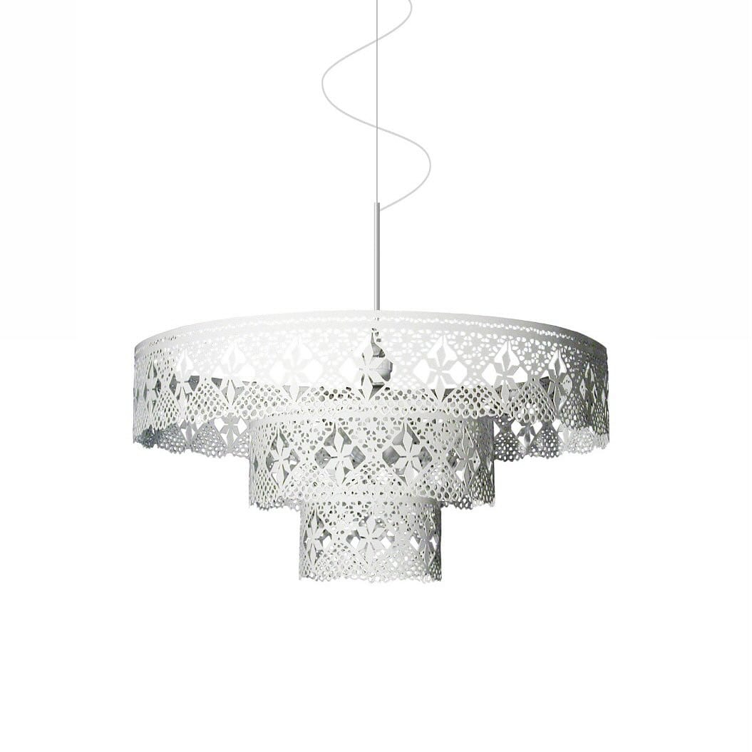 The chandelier is a further development from the strip of lace that is laser cut out of 1mm thick metal sheet to get this light feeling. It was interesting to give a hard material the illusion of being thin and fragile. I want you to feel a festive feeling when you use these products.