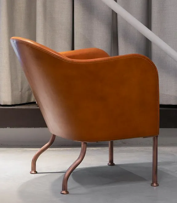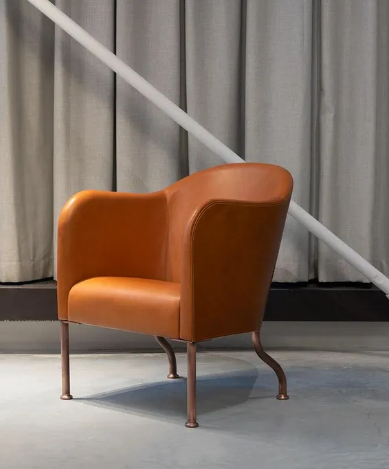 Seat and back in cold foam. Inside upholstered with leather. Outside with Tärnsjö prime leather. Steel legs in chrome, black oxide, brass or coppered. Art. 235, H82 W62 D75 SH42 cm