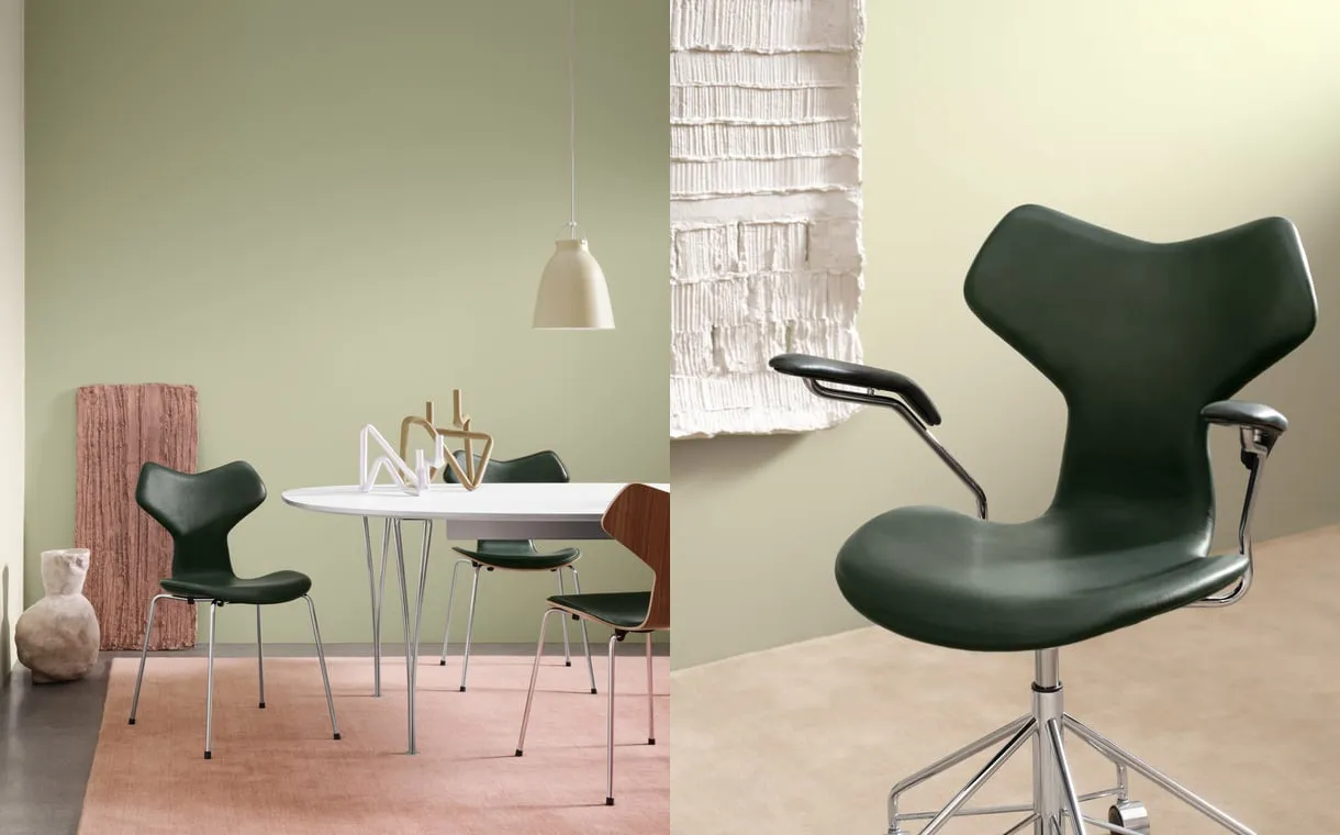 Fritz Hansen proudly presents Grand Prix™ Editions – a curated range of iconic Grand Prix chairs uniquely presented in walnut and premium green leather.